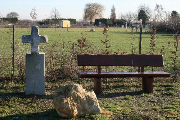 Blausteinkreuz in Merzenich - Golzheim Denkmalbeschreibung Baujahr wahrscheinlich 17. Jahrhundert; kleines Blausteinkreuz mit unleserlicher Inschrift, Lage nicht ursprünglich. Reste der Inschrift in gotisierender Form noch vorhanden, Kanten des Kreuzes gebrochen, das Kreuz stark verwittert, seit der Bestandsaufnahme keine Aufarbeitung. Standort wurde nach einer Überarbeitung um 100 m verlegt.