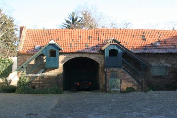 Denkmalbeschreibung Baujahr 18. Jahrhundert und 1768 laut Maueranker; das Wohnhaus 1774 laut Türsturzdatierung; offene 4-flügelige Hofanlage aus Backstein, zur Straße ein 1-geschossiger Torflügel mit mittlerem, pavillonartigem Torbau und Mansarddach, das straßenseitige Traufgesims mit abgerundeten Backsteinen geformt, der Hof rechts mit eisendatiertem Scheunen Flügel, dieser mit 2 korbbogigen Zufahrten und weit vorkragendem Dach, dem Torbau gegenüber ein weiterer 1-geschossiger Bau, mit achsial dem Torbau gegenüberliegender, korbbogier Durchfahrt zum rückwärtigen Gelände, die Durchfahrt flankieren hofseitig 2 Seitentreppen der Zeit um 1900 mit hölzernen Überdachungen, die linke Seite des Hofes nimmt ein freistehendes Wohnhaus ein mit 5:2 Achsen und Walmdach, das Wohnhaus aus Backstein mit Ecken aus Werkstein verstärkt, die Fenster und Türen mit geradem Sturz und Blausteingewänden, die Eingangstür in der 4. Achse mit Oberlicht, das Erdgeschoß rundum vergittert. Abschnittsweise Renovierung des Wohnhauses in enger Abstimmung mit dem Rheinischen Amt für Denkmalpflege, um 1980 Änderung des Treppenaufgangs, die ursprüngliche Raumaufteilung wurde erhalten, im Obergeschoß Kölner Decken freigelegt und wiederhergestellt, im Erdgeschoß ebenfalls beabsichtigt, im Wohnzimmer soll sich unter dem Teppichboden ein Keramikbelag in Mosaikform erhalten haben, der ebenfalls freigelegt werden soll, unter dem Außenputz sollen sich noch gemauerte Rundbögen oberhalb der Fensterstürze befinden. Der Hof wurde zum Teil neu gepflastert, die Scheune neu eingedeckt, die Stallungen blieben außen unverändert, im Inneren 2000 als Büro und Werkstätten genutzt, der vordere Bogen der den Torbau gegenüberliegenden Durchfahrt nach Beschädigung erneuert.