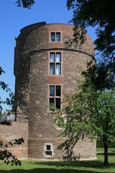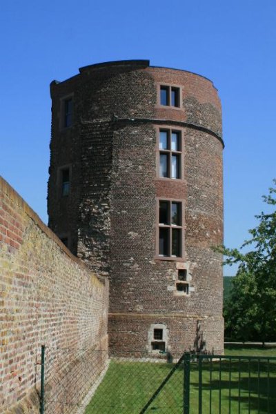 mit Blaustein- und Rotsandsteingliederungen; erhalten 3 runde Ecktürme,