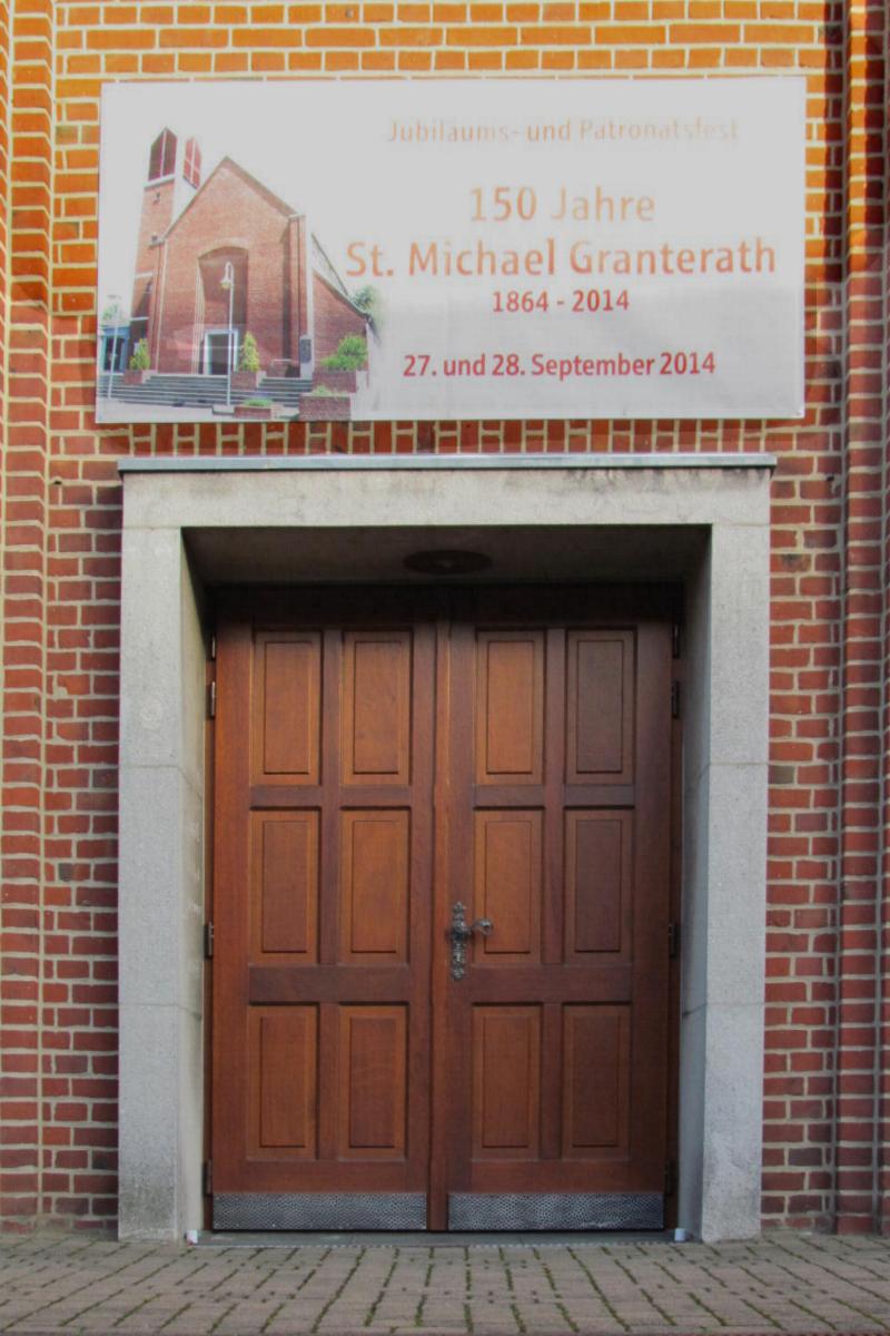 Standort: Die Kirche St. Michael hat ihren Standort In Granterath 20, im Ortsteil Granterath in der Stadt Erkelenz im Kreis Heinsberg. Geschichte: Der katholische Kirchenbau-Verein zu Granterath ließ um 1859 von Heinrich Nagelschmidt aus Köln den Plan für eine Kirche zeichnen. Am Fest des Erzengels Michael 1863 wurde der Grundstein gelegt. Am 12. August 1900 wurde die Kirche geweiht. 1923 mußte sie renoviert werden, wobei die flache Holzdecke durch ein Gewölbe ersetzt wurde. Der Plan war von Kreisbaumeister Pickemeyer. 1952 wurde die Frontmauer restauriert. Nach Plänen von Josef Viethen wurde 1956 ein Turm statt des Dachreiters erbaut. 1957/58 wurde das rechte, 1967 das linke Seitenschiff erneuert. Unter der Leitung des Architektenteams Lennartz wurde 1989 die Kirche renoviert. Architektur: Bei dem Bauwerk handelt es sich um einen Backsteinbau mit zwei ungleichen, niedrigen Seitenschiffen, einem Chorjoch und eine halbrunde Apsis. Die vier Joche der alten Kirche haben Kreuzgewölbe, die Seitenschiffe haben flache Decken. Der fünfgeschossige Turm ist wenig gegliedert und steht an der Westseite des linken Seitenschiffs. Quellenhinweis: * Dritte Ausgabe 1994: Handbuch des Bistums Aachen ISBN 3-87448-172-7 S. 657 - 658 * Zur Dorf- und Pfarrgeschichte von Granterath, v. Konrad Hittingen, HK. der Erkl. Lande 1964 S.71-81 Ausstattung: * In der Kirche ein Hochaltar, ein Taufstein aus 1864, Kreuzwegstationen und mehrere Heiligenfiguren. * Die Orgel mit 9 Registern und pneumatischen Traktur wurde 1949 von der Fa. Bach aus Aachen gebaut. * Am Kirchturm ist eine Turmuhr eingebaut. * Im Kirchturm befinden sich drei Glocken aus den Jahren 1400 und 1947. * Glockengeläute der Kirche St. Michael * Die Kirche besitzt eine Buntverglasung