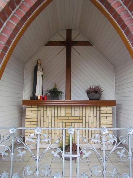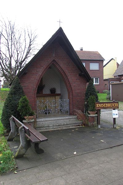 Beschreibung: Die Kapelle Endebruch befindet sich im Ortsteil Kirchhoven der nordrhein-westfälischen Kreisstadt Heinsberg. Sie steht am Endebrucher Weg. Sie ist der Mutter Gottes geweiht. Die Kapelle wird auch als Prozessionskapelle genutzt. Geschichte: Endebruch war ursprünglich ein zur Bürgermeisterei Kirchhoven zugehöriges Dorf.[1]. Die Kapalle im heute nicht mehr selbstständigen Dorf entstand 1958, finanziert über Spenden, und in Eigenleistung der Dorfbewohner. Den Bauplatz stiftete Maria Theberath. Am 17. März 1958 war der erste Spatenstich, zwei Tage später bereits die Grundsteinlegung. Der Entwurf und die Bauleitung lagen in der Hand des Architekten Gerhard Hanrath. Am 1. Juni 1958 wurde die Kapelle durch Pfarrer Görtz geweiht. Im Jahr 1999 wurde die Kapelle renoviert. Architektur: Bei dem Gebäude handelt es sich um einen freistehenden Backsteinbau mit einer spitzbogigen Öffnung. Das Satteldach ist über dem Eingangsbereich leicht vorgezogen und fällt zur Rückwand hin leicht ab. Die Kapelle ist über zwei Steinstufen zu betreten. Der Innenraum ist mit einer weißen Holzvertäfelung verkleidet. Ausstattung: * In der Kapelle stehen ein Altar, ein Kruzifix und eine Marienfigur. * Die Kapelle wird durch ein schmiedeeisernes Gitter abgeschlossen. Quellenhinweis: * Dritte Ausgabe 1994: Handbuch des Bistums Aachen ISBN 3-87448-172-7 * Kapelle Endebruch (Kirchhoven) bei Wikipedia
