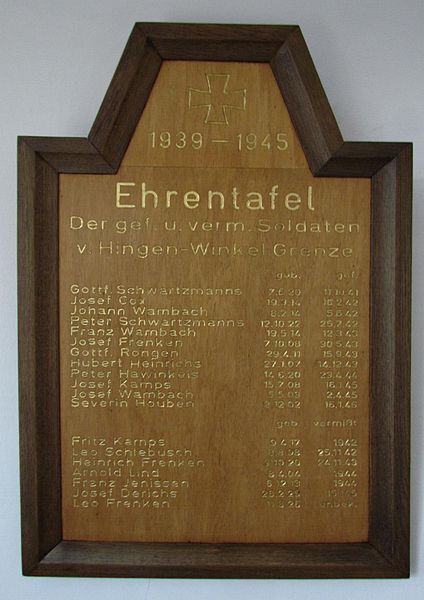mit einbezogen. Ausstattung: * In der Kapelle sind ein Altar, ein Kruzifix, zwei Heiligenfiguren, Kerzen und Blumenschmuck. * Ehrentafel mit den Namen der gefallenen und vermißten Soldaten des Krieges 1939-1945. * Die Rundfenster am Altar und die Eingangsseite sind mit Buntverglasung versehen. Quellenhinweis: * Dritte Ausgabe 1994: Handbuch des Bistums Aachen ISBN 3-87448-172-7 * Festschrift zum Bezirksschützenfest 2010 der St. Severini Schützenbruderschaft Karken e.V * Kapelle Hingen (Karken) bei Wikipedia) * Text: Mathias Helmgens