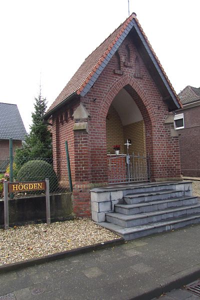 Beschreibung: Die Kapelle Högden befindet sich im Ortsteil Kirchhoven der Stadt Heinsberg in Nordrhein-Westfalen. Sie steht in freier Ortslage. Geschichte: Die Högdener Kapelle blickt auf eine fast 100-jährige Geschichte zurück. An der Stelle der heutigen Kapelle stand bereits seit 1642 ein Hagelkreuz. Der mündlichen Überlieferung nach, haben Eltern aus Dankbarkeit für die glückliche Heimkehr ihrer Söhne aus dem Ersten Weltkrieg diese Kapelle erbaut. 1990/91 wurde sie renoviert. Im November 2012 wurde aus der Kapelle das Kruzifix gestohlen. Der unbeschädigte Korpus und ein neu angefertigtes Kleeblattkreuz wurde bei der Fronleichnamsprozession 2013 neu eingesegnet. Architektur: Bei dem Gebäude handelt es sich um einen Backsteinbau mit einer spitzbogigen Öffnung. Die Kapelle steht am Hang und ist von der Straße her über fünf Stufen erreichbar. Ein steiles Satteldach bedeckt die Kapelle. Im Inneren ist die Kapelle mit hellen Ziegelsteinen verklinkert. Ausstattung: * In der Kapelle sind ein Altar, ein Kruzifix und Blumenschmuck vorhanden. * Im Eingangsbereich ist ein schmiedeeisernes Gitter angebracht. Quellenhinweis: * Dritte Ausgabe 1994: Handbuch des Bistums Aachen ISBN 3-87448-172-7 * Neues Holzkreuz für die Högdener Kapelle (AZ vom 31. Mai 2013) * Kapelle Högden (Kirchhoven) bei Wikipedia