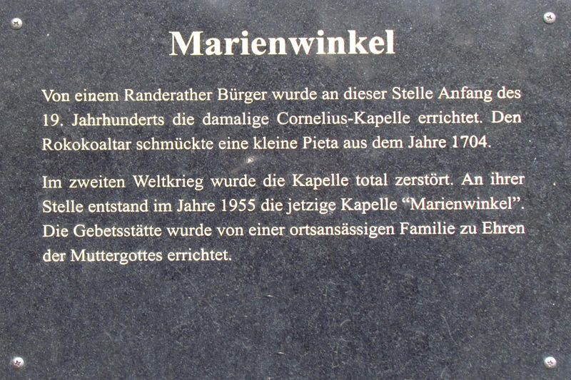 Beschreibung: Die Kapelle Marienwinkel befindet sich im Ortsteil Randerath der Stadt Heinsberg in Nordrhein-Westfalen. Die Kapelle steht an der Feldstraße 70, etwa 200 m von der Pfarrkirche St. Lambertus entfernt. Geschichte: Die im 18. Jh. als Votivkapelle von Franz Josef Meyer errichtete St. Cornelius-Kapelle wurde 1880 der Kirche übereignet. Den Rokokoaltar schmückte eine kleine Pietá aus dem Jahr 1704. Im Zweiten Weltkrieg wurde die Kapelle total zerstört. An ihrer Stelle entstand im Jahr 1955 die jetzige Kapelle Marienwinkel. Die Gebetsstätte wurde von einer ortsansässigen Familie zu Ehren der Muttergottes nach einem Plan von Franz-Josef Klother errichtet. 2003 wurde die Kapelle renoviert und mit einem neuen Eingang versehen. Architektur: Bei dem Gebäude handelt es sich um einen kleinen, rechteckigen Backsteinbau mit einem Flachdach. Die Enden der Seitenwand, sind zwei sich verjüngende Strebepfeiler, die einem Glockenturm bilden. Innen ist die Kapelle weiß gestrichen. Ausstattung: * Im Glockenturm hängt eine kleine Glocke. * Am Eingang sind zwei Infotafeln angebracht. * Im Inneren stehen eine Madonna, eine Kruzifix und Blumenschmuck. Quellenhinweis: * Dritte Ausgabe 1994: Handbuch des Bistums Aachen ISBN 3-87448-172-7 * Kapelle Marienwinkel bei Wikipedia