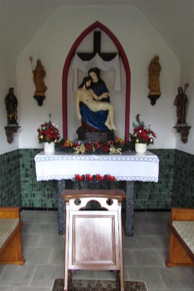 Beschreibung: Das Muttergotteskapellchen im Kirchfeld an einer Wegkreuzung im freien Feld, wie es im Jahr 1927 in der Heinsberger Volkszeitung umschrieben und genannt wurde, steht heute altehrwürdig in einer geschlossenen Bebauung. An der Kreuzung Hirtstraße, Prunkstraße und Schierenkreuz erinnert nichts mehr an den weiten Blick ins Feld den man zur Bauzeit um 1800 hatte. Mathias Helmgens schreibt 1970: „Die zwei Lindenbäume, die heute vor 80 Jahren beiderseits des Kapellchens gepflanzt wurden, geben Schutz vor Wind und Wetter. Vorher haben ebenfalls zwei mächtige Linden dort gestanden.“ Sie wurden gefällt, weil sie das Mauerwerk des Kapellchen beschädigten“. Auch die neuen Linden, inzwischen fast 140 Jahre alt, bedrohten und beschädigten die Bausubstanz. Daher wurden sie bei der Renovierung der Kapelle im Februar 2005 gefällt. Bis zur Einweihung am 29. August 2006, durch Pfarrer Marian Janke haben die Nachbarn von der Hirtstraße, Prunkstraße, Stiegel und Panthaag mit großen Anstrengungen in finanzieller Sicht, aber auch durch Fleiß und persönlichen Arbeitseinsatz beachtliches zur Verschönerung und Erhaltung des kleinen Gotteshauses geleistet. Zu den Maiandachten sind die Nachbarn und alle Pfarrangehörigen herzlich eingeladen. Auf dem Prozessionsweg am Fronleichnamstag ist hier Gebets- und Segenstation. Es lädt den Gläubigen zum Verweilen und Meditieren ein, um in andächtiger Anbetung der Mutter Gottes Dank zu sagen und Fürbitte zu sprechen. Quellenhinweis: * Festbuch Bezirksschützenfest 2010 der St. Severin Bruderschaft Karken * Text: Mathias Helmgens