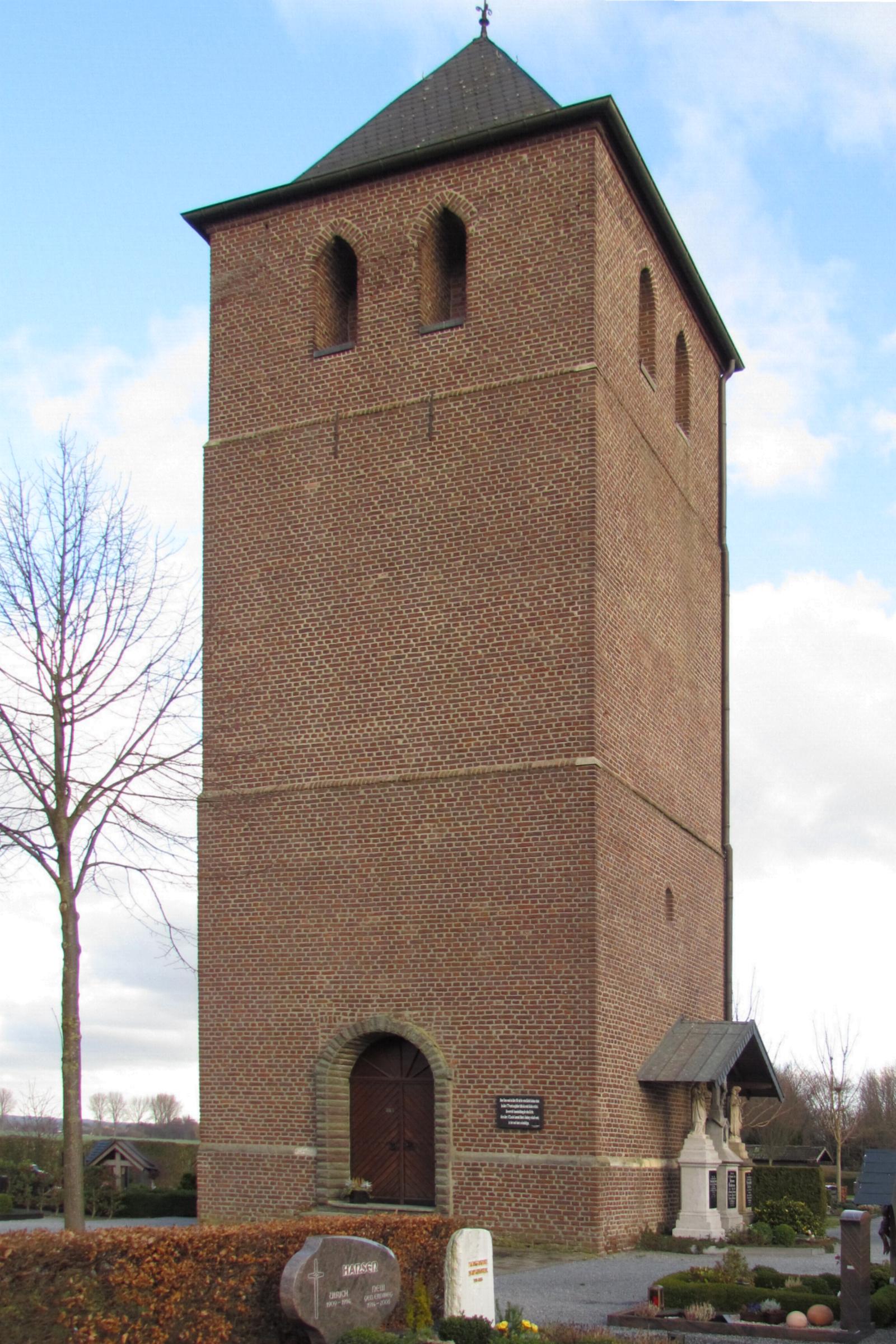 Standort: Der Kirchturm hat seinen Standort in zentraler Lage auf dem Friedhof an der Straße Tichelkamp im Stadtteil Karken in der Stadt Heinsberg. Beschreibung: Dieser Turm wurde im Jahre 1561 mit der ersten Kirche Karkens erbaut. Im Jahr 1779 wurde an gleicher Stelle die zweite Kirche errichtet. Die wertvolle Inneneinrichtung der alten Kirche, die im Jahre 1922 an die Gemeinde Rahm b. Duisburg verkauft wurde, ist dort noch heute zu besichtigen. Quellenhinweis * Dritte Ausgabe 1994: Handbuch des Bistums Aachen ISBN 3-87448-172-7 S. 744 * Geschichte der St. Hubertus-Kirche zu Rahm und ihrer Gemeinde ISBN: 978-3-00-046459-1