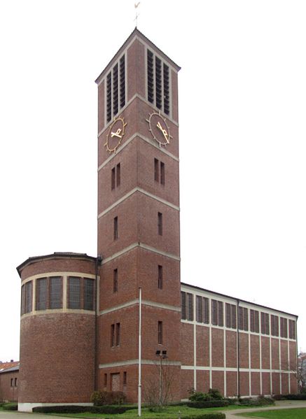 Eine Kirche hat viele Gesichter Beschreibung: Die Kirche St. Aloysius befindet sich im Ortsteil Oberbruch in der Stadt Heinsberg in Nordrhein-Westfalen. Die Kirche ist der Mittelpunkt des Ortes. Der freistehende Kirchenbau ermöglicht die Betrachtung aus verschiedener Perspektive. Geschichte: Die erste Kapelle stammte aus dem Jahre 1859. Pläne für einen Neubau oder einer Vergrößerung wurden von Peter Bartz aus Heinsberg vorgelegt. Nach der Gründung des St.-Aloysius-Bauverein um 1900 wurde beschlossen, die alte Kapelle abzureißen und eine neue Kirche zu bauen. Am 16. Juni 1907 war die Grundsteinlegung. Die 1907 fertiggestellte Kirche wurde am 24. Januar 1945 durch Sprengung zerstört. Nach Plänen von Architekt Peter Salm aus Aachen wurde die Kirche 1951/52 neugebaut. Dabei wurde das noch stehende südliche Seitenschiff einbezogen. Die feierliche Weihe war am 1. Juli 1956. 1966 wurde eine Holzdecke eingezogen, 1976 wurde die Kirche renoviert. Architektur: Die Kirche ist ein Stahlbetonskelettbau mit Backsteinfüllung und einem südlichen, niedrigen Seitenschiff. Die Decke ist leicht gewölbt. Der Altarraum ist rundbogig geschlossen. Nördlich vom Altarraum steht der vierseitige Turm mit einem vierseitigen Pyramidenhelm. Ausstattung: * Die Orgel mit 33 Registern, mit einer elektropneumatischen Traktur aus dem Jahre 1955, wurde von Johannes Klais aus Bonn gebaut. Ein Renovierung wurde 1979 durch die Fa. Wilbrand aus Übach-Palenberg durchgeführt. * Im Kirchturm befinden sich vier Glocken aus den Jahren 1931 und 1957. * Mehr Infos über die Glocken von Oberbruch im Glockenbuch Seite 195. * Am Kirchturm ist eine Turmuhr eingebaut. * Die Kirche besitzt eine Buntverglasung. * Altar aus Blaustein, Tabernakel aus Bronze, mehrere Heiligenfiguren. Quellenhinweis: * Dritte Ausgabe 1994: Handbuch des Bistums Aachen ISBN 3-87448-172-7 * 75 Jahre Pfarrgemeinde St. Aloysius Oberbruch 1918-1993 * St. Lambertus in der Gdg Heinsberg-Oberbruch * Die Gemeinschaft von Gemeinden Heinsberg-Oberbruch * St. Aloysius (Oberbruch) bei Wikipedia