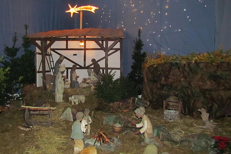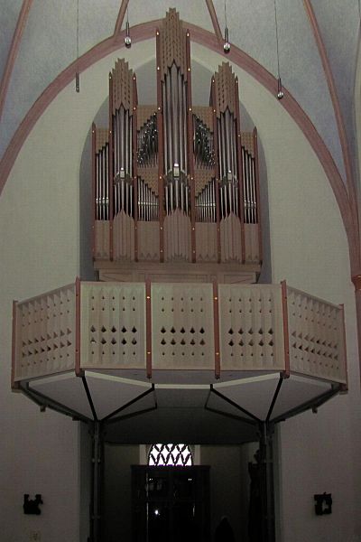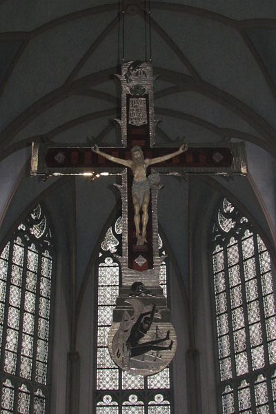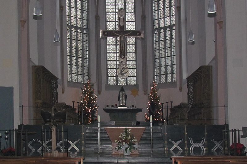 Beschreibung: St. Gangolf ist eine katholische Pfarrkirche und ehemalige Stiftskirche in der rheinischen Stadt Heinsberg. Sie steht als Baudenkmal unter Denkmalschutz. Architektur: Die dreischiffige gotische Hallenkirche aus dem 15. Jahrhundert hat eine lichte Länge von rund 53 m und einer lichte Breite von etwa 22,5 m. Ihre Strebepfeiler sind außer am Chor nach innen gezogen, sie treten an der Außenseite nur durch dreieckige Mauervorlagen in Erscheinung. Das fünfjochige Mittelschiff und der aus zwei rechteckigen Jochen und dem dreiseitig geschlossenen, etwas größeren Ostjoch gebildete Chor sind von Netzgewölben überspannt; die mit zwei weiteren Jochen rechts und links des Turmes verlängerten Seitenschiffe dagegen mit einfachen Kreuzgewölben. Erheblich über dem Niveau des eigentlichen Kirchenschiffes liegt der Hochchor, unter diesem die romanische Krypta des Vorgängerbaues aus der Mitte des 12. Jahrhundert. Diese ist als dreischiffige, niedrige Halle ausgeführt, verfügt über etwas mehr als vier Joche und einen geraden Ostabschluss. Das Gewölbe der Krypta wird von acht kurzen, recht derben Säulen und rechteckigen Pilastern an den Wänden getragen. Die Würfelkapitelle der Krypta liegen auf reich durchgebildeten Kämpferplatten. St. Gangolf erhielt im Jahr 2004 einen neuen Turmhelm in pyramidaler Form. Der frühere, unter Weiterverwendung von Teilen des Dachstuhles eines barocken Helmes errichtete neugotische Turmhelm aus dem 19. Jahrhundert war beim Bombenangriff der Royal Air Force auf Heinsberg vom 16. November 1944 schwer beschädigt worden. Aufgrund der Schäden stürzte die neugotische Konstruktion bei einem Wintersturm am 28. Dezember 1945 größtenteils ein; beim Wiederaufbau der Kirche in der Nachkriegszeit hat man diese nicht rekonstruiert, sondern nur das verbliebene Helmteil mit einer niedrigen Dachhaube geschlossen. Die Neukonstruktion des Jahres 2004 wurde in einer gewichtssparenden Tafelschalungsbauweise elementweise am Boden vorgefertigt, die einzelnen Elemente sind sodann an einem Tag ohne Einrüstung mittels eines Schwerlastkranes auf den Turmschaft aufgesetzt worden. Das verbliebene denkmalgeschützte Teilstück des barocken Dachstuhles konnte gleichwohl auf dem Turmschaft verbleiben, da die Neukonstruktion über diesen alten Dachstuhl gestülpt ist. Ausstattung: * Taufkessel: Die Kirche ist ausgestattet unter anderem mit einem im Gelbgussverfahren um 1500 hergestellten gotischen Taufkessel. Er wurde vermutlich von einem maasländischen Meister hergestellt, ist reich durchgebildet und wird von drei liegenden Löwenfiguren getragen. Der eine Statuette des heiligen Gangolf tragende Deckel kann mittels eines schmiedeeisernen, in gotischen Formen verzierten Kranes zur Seite geschwenkt werden. * Grab der Herren von Heinsberg: Nennenswert ist weiter das Hochgrab der Herren von Heinsberg aus dem 15. Jahrhundert, eine der hervorragenden Arbeiten dieser Art im Rheinland. Auf dem Grab sind, gearbeitet in feinstem Kalkstein, als liegende Figuren dargestellt Johann II. von Heinsberg († 1438), dessen Gemahlin Margarethe von Gennep († 1419) sowie deren Sohn Johann III. von Heinsberg († 1443). Die wie die Deckplatte aus fast schwarzem, polierten Stein gearbeiteten Wangen des Grabmales sind mit Ahnenwappen geziert. Dargestellt sind (in der Schreibweise der Beischriften auf dem Denkmal) auf der linken, männlichen Seite die Wappen von Loen, Holland, Chyny, Heinsberg, Gilych, Engeland, Brabant und Schottland sowie auf der rechten, weiblichen Seite diejenigen von Genepe, Altenburg, Vlandern, Bruynenburg, Erkel, Lippe, Gelder und Heube. Somit werden dem Betrachter aber, wie etwa mit Engeland, auch einige in der tatsächlichen Ahnenreihung des figürlich dargestellten Herrscherpaares nicht stimmige Wappen präsentiert. Die nur 2,3 m lange und 1,7 m breite Gruft der Herren von Heinsberg befand sich unterhalb des Hochgrabes und reichte ursprünglich bis unter die Deckplatte. Sie war nur durch einen schrägen Schacht an der Ostseite des Grabes zugänglich. Das Hochgrab wurde erstmals im ersten Jahrzehnt des 20. Jahrhunderts wiederhergestellt, damals beseitigte man Beschädigungen, die durch einen Gewölbeeinsturz im Jahre 1783 entstanden waren; ein weiteres Mal nach schweren Kriegsschäden im Zweiten Weltkrieg. * Chorgestühl und Kreuztragungsgruppe: Schwer beschädigt und in Teilen zerstört wurde im Zweiten Weltkrieg auch das Chorgestühl mit seinen reich geschnitzten Wangen aus der Mitte des 15. Jahrhunderts. Es ist inzwischen mit reduzierter Sitzplatzzahl restauriert bzw. teilweise rekonstruiert worden. Eine um 1500 entstandene, etwa zwei Meter hohe Kreuztragungsgruppe zeigt den mit geschlossenen Lidern das Kreuz beidarmig tragenden Christus und den erheblich kleiner dargestellten Simon von Cyrene. * Hochaltar: Der im Hochchor gelegene Hochaltar ist ein Werk des Bildhauers Hein Minkenberg. Vier die Evangelisten symbolisierende Figuren tragen eine schwere Muschelkalkplatte. * Reliquien: In St. Gangolf werden Reliquien der heiligen Hedwig von Andechs aufbewahrt, einer Enkelin der Mathilde von Heinsberg. * Glocken: Im Glockenstuhl des Kirchturms sind 6 Glocken aus den Jahren 1764 und 1964 untergebrachte. Mehr Infos über die Glocken von Heinsberg im Glockenbuch Seite 164. * Buntvergalasung:Durch eine Bunt- und geometrische Ornamentverglasung an der Pfarrkirche St. Gangolf wird das Gotteshaus aufgewertet. Bunt- und Ornamentverglasung. * Orgel:Die Orgel wurde 1993 von der Orgelbaufirma Seifert (Kevelaer) erbaut. Das Instrument hat 39 Register auf drei Manualen und Pedal. Die Spieltrakturen und Registertrakturen sind mechanisch. Mehr Infos zur Orgel. Presseberichte: * 750 Jahre Altarweihe (Kirchenzeitung 37/2012) * St. Gangolf: Altar Jubiläum nur per Zufall entdeckt.(AZ vom 12. September 2012) * Das letzte Fenster von St. Gangolf ist fertig. (AZ von 22. März 2013) Quellenhinweis: * Dritte Ausgabe 1994: Handbuch des Bistums Aachen ISBN 3-87448-172-7 * Band Acht 1906: Die K