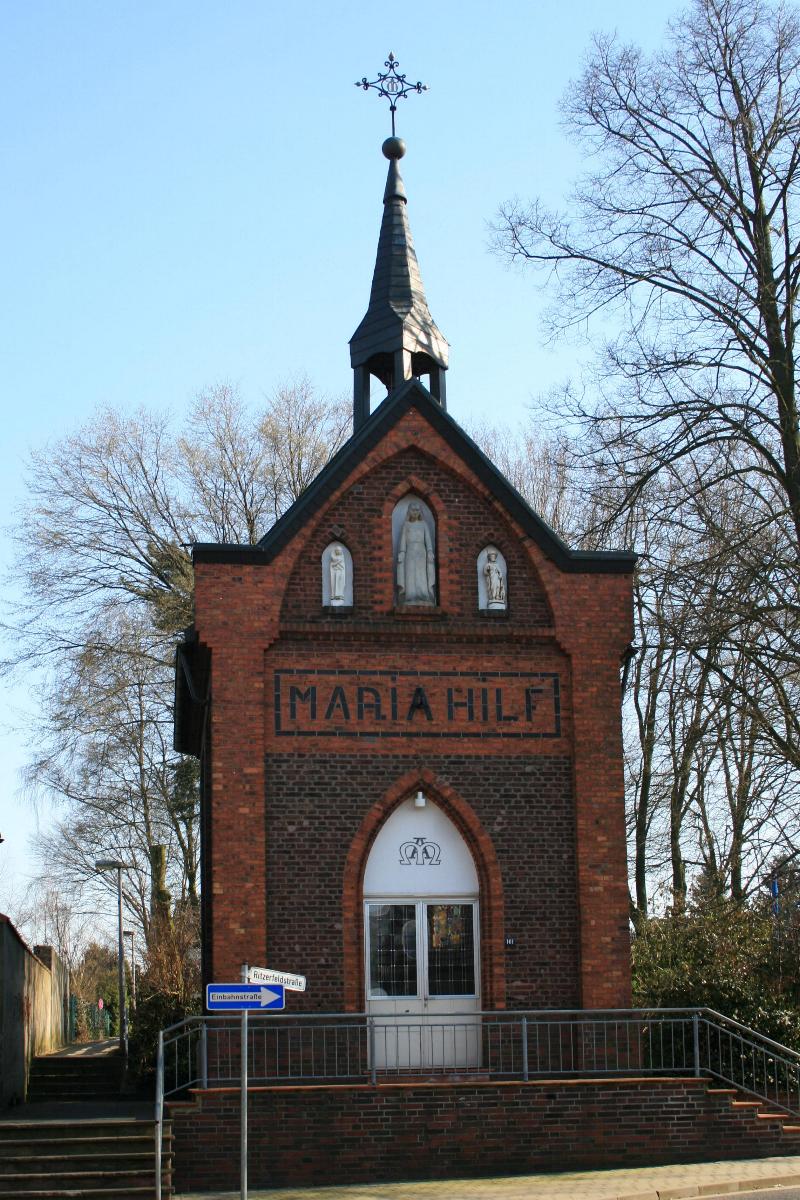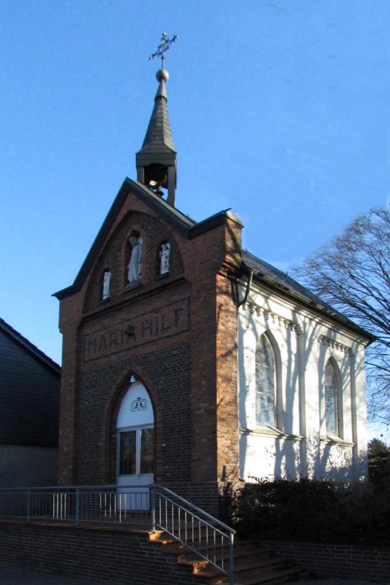 Standort: Die Kapelle Maria- Hilf hat ihren Standort an der Hauptstraße 161, im Stadtteil Brachelen, in der Stadt Hückelhoven, im Kreis Heinsberg. Die Kapelle steht als Denkmal Nr. 87 in der Denkmalliste der Stadt Hückelhoven unter Denkmalschutz. Geschichte: 1812 baute man an der Stelle, an der bei Ausschachtungsarbeiten eine Muttergottes-Statue gefunden wurde, eine kleine Kapelle, die Ziel vieler Beter wurde. 1879 wurde eine größere Kapelle nach Plan von Laurenz Docter aus Jülich gebaut. 1945 wurde sie vollkommen durch Kriegseinwirkungen zerstört. Bis 1952 wurde sie durch Anwohner wiederaufgebaut und am Mariä-Lichtmesstag an 2. Februar 1952 wieder eingeweiht. Architektur: Bei dem Bauwerk handelt es sich um einen kleinen Backsteinbau unter einem Satteldach. Darauf steht ein vierseitiger Dachreiter mit einem Kapellenkreuz. Die zweiachsige Kapelle hat einen dreiseitigen Chor und Kreuzrippengewölbe. Der Eingang, die Fensteröffnungen und die Blendarkade des Giebels sind spitzbogig. In drei Nischen der Giebelwand stehen Steinfiguren der Gottesmutter, des hl. Rochus und der hl. Agatha Quellenhinweis: * Dritte Ausgabe 1994: Handbuch des Bistums Aachen ISBN 3-87448-172-7 S. 764-767 Ausstattung: * Die Kapelle besitzt eine elektronische Orgel (Stiftung von Pfr. Kann aus Broichweiden) * In der Kapelle befindet sich ein Altar und mehrere Heiligenfiguren und Bilder. * Im Dachreiter befindet sich eine Glocke. * Mehr Infos zu den Glocken von Brachelen im Verzeichnis Glocken in der Region Heinsberg * Die Kapelle besitzt eine Buntverglasung Infoberichte: * Webseite zur Geschichte von St. Gereon und der Kapelle Maria Hilf in Brachelen * Die Gemeinschaft der Gemeinden in Hückelhoven * Denkmalliste Hückelhoven Nr. 87, Eintrag: 20. Dezember 1985