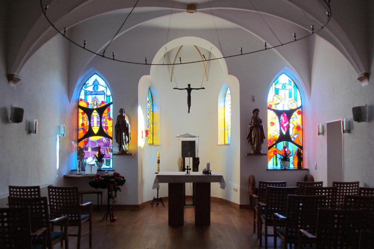 Standort: Die Kapelle im Altenheim Haus Berg hat ihren Standort am Klosterberg 5, im Stadtteil Brachelen, in der Stadt Hückelhoven, im Kreis Heinsberg. Die Kapelle steht mit dem Haus Berg als Denkmal Nr. 326 in der Denkmalliste der Stadt Hückelhoven unter Denkmalschutz. Geschichte und Architektur: Am 19. Juni 1865 kaufte der Pfarrer Johann Peter Rademacher (1863-67) das Heinsberger Lehen Haus Berg. Die Gebäude stammten aus der Zeit um 1700. Nach einem Ausbau des Hauses zum Kloster wurde 1868 in demselben eine Waisen-, Kleinkinderbewahr- sowie Verpflegungsanstalt für arme und alte Leute eingerichtet. Die Leitung des Hauses übernahmen Ordensschwestern, Franziskanerinnen von der Heiligen Familie. Das Haus wurde im Krieg sehr stark beschädigt. Restaurierungen und Erweiterungen wurden nach 1945 durchgeführt, ebenso eine Sanierung im Jahre 1985. Das Haus wird heute mit weiteren errichteten Gebäuden im Umfeld als Alten- und Pflegeheim genutzt. Die Kapelle im Altenheim Haus Berg wird stetig genutzt und ist Bestandteil des Hauses. Quellenhinweis: * Dritte Ausgabe 1994: Handbuch des Bistums Aachen ISBN 3-87448-172-7 S. 764-767 Ausstattung: * Die Kapelle besitzt eine elektrische Orgel. * In der Kapelle befindet sich ein Altar und mehrere Heiligenfiguren und Bilder. * Im Dachreiter befindet sich eine Glocke. * Mehr Infos zu den Glocken von Brachelen im Verzeichnis Glocken in der Region Heinsberg * Die Kapelle besitzt eine Buntverglasung Infoberichte: * Webseite zur Geschichte von Haus Berg * Einst Kloster der Armen und Kranken (RP 15. Juli 2014) * Denkmalliste Hückelhoven Nr. 326 Eintrag: 22. August 1991