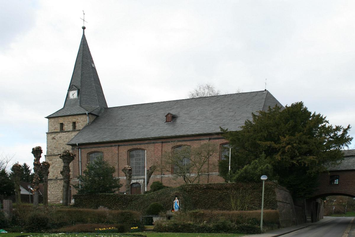 Standort: Die Kirche St. Dionysius hat ihren Standort an der Dionysiusstraße 6, im Stadtteil Doveren, in der Stadt Hückelhoven, im Kreis Heinsberg. Die Kirche steht als Denkmal Nr. 15 in der Denkmalliste der Stadt Hückelhoven unter Denkmalschutz. Geschichte: Eine warscheinlich dreischiffige Holzpfostenkirche wurde Ende des 9. Jahrhunderts zerstört. Kurz darauf baute man eine Steinkirche als Saalkirche mit Rechteckchor. Im 15. Jahrhundert wurde der Chor vergrößert und der Westturm gebaut. Im 18. Jahrhundert war der Bau in einem so schlechten Zustand, das 1771 ein neues großes Langhaus an den alten Turm gebaut wurde: eine Saalkirche mit dreiseitigem Abschluß. Ende des letzten Krieges wurde die Kirche am 24. Februar 1945 gesprengt, der Turm blieb fast unversehrt. Bis 1950 war sie wieder aufgebaut. Am 26. November 1950 war die feierliche Weihe. Architektur: Bei dem Bauwerk handelt es sich um einen einschiffigen Backsteinsaalbau mit einem dreiseitigen Chor in der Breite des Langschiffs. Die an der Ostseite des Chors auf einem die Straße überspannenden Bogen angebaute Sakristei hat Verbindung mit dem Pfarrhaus. Der viergeschossige, vorgelagerte Westturm hat an der Ostwand des Untergeschosses Mauerwerk von der Kirche des 9. / 10. Jahrhunderts. Quellenhinweis: * Dritte Ausgabe 1994: Handbuch des Bistums Aachen ISBN 3-87448-172-7 S. 764-767 Ausstattung: * Die Kirche hat 150 Sitz- und 100 Stehplätze. * In der Kirche ein Altar, ein Tabernakel, eine Kreuzigungsgruppe, ein Taufbecken und Heiligenfiguren. * Im Kirchturm ist eine Turmuhr eingebaut. * Die Orgel mit 15 Registern und einer elektrischen Traktur stammt aus dem Jahr 1969. * Im Kirchturm befinden sich vier Glocken aus dem Jahren 1499 und 1971. * Mehr Infos zu den Glocken von Doveren im Verzeichnis Glocken in der Region Heinsberg * Die Kirche besitzt eine Buntverglasung * Glockengeläute der Kirche in Doveren Infoberichte: * Die Pfarre St. Dionysius Doveren bei Wikipedia * Die Gemeinschaft der Gemeinden in Hückelhoven * Denkmalliste Hückelhoven Nr. 15, Eintrag: 12. Januar 1983