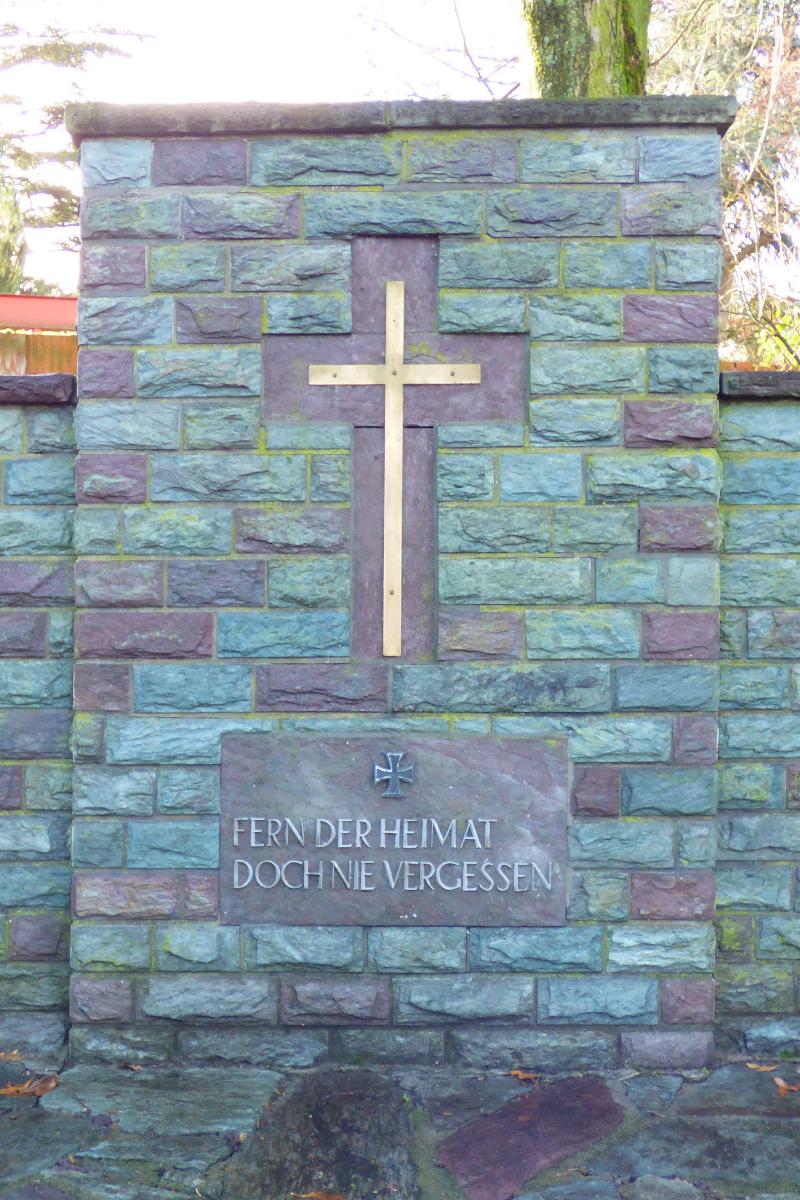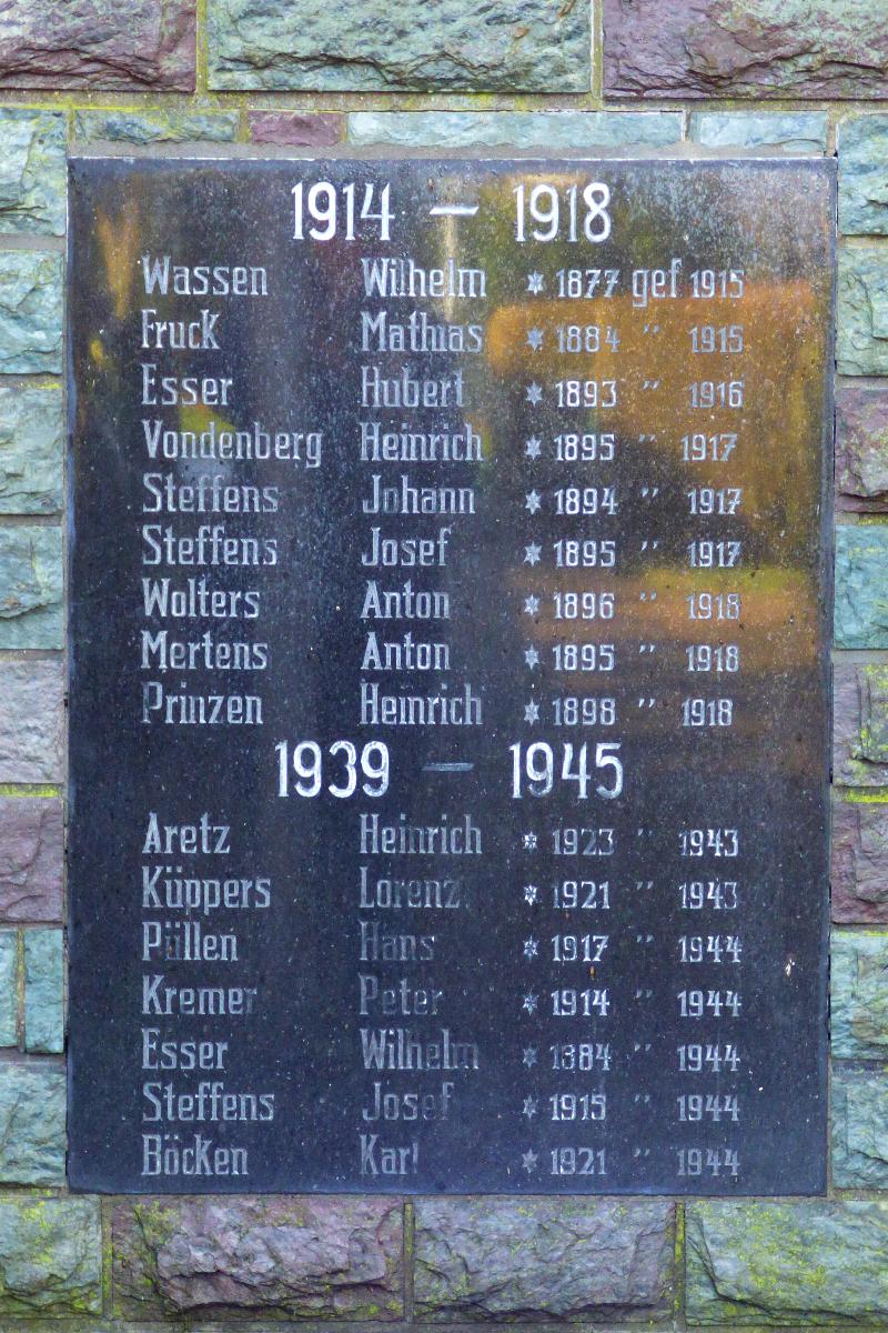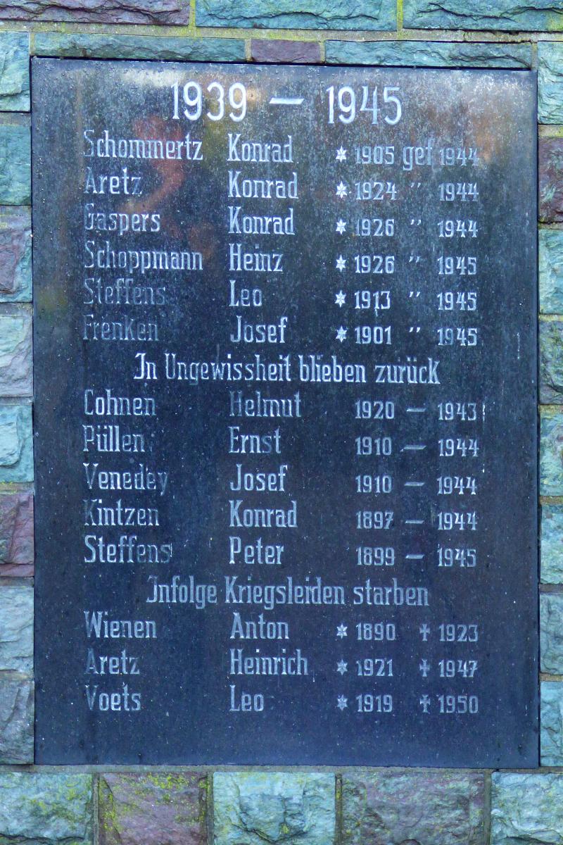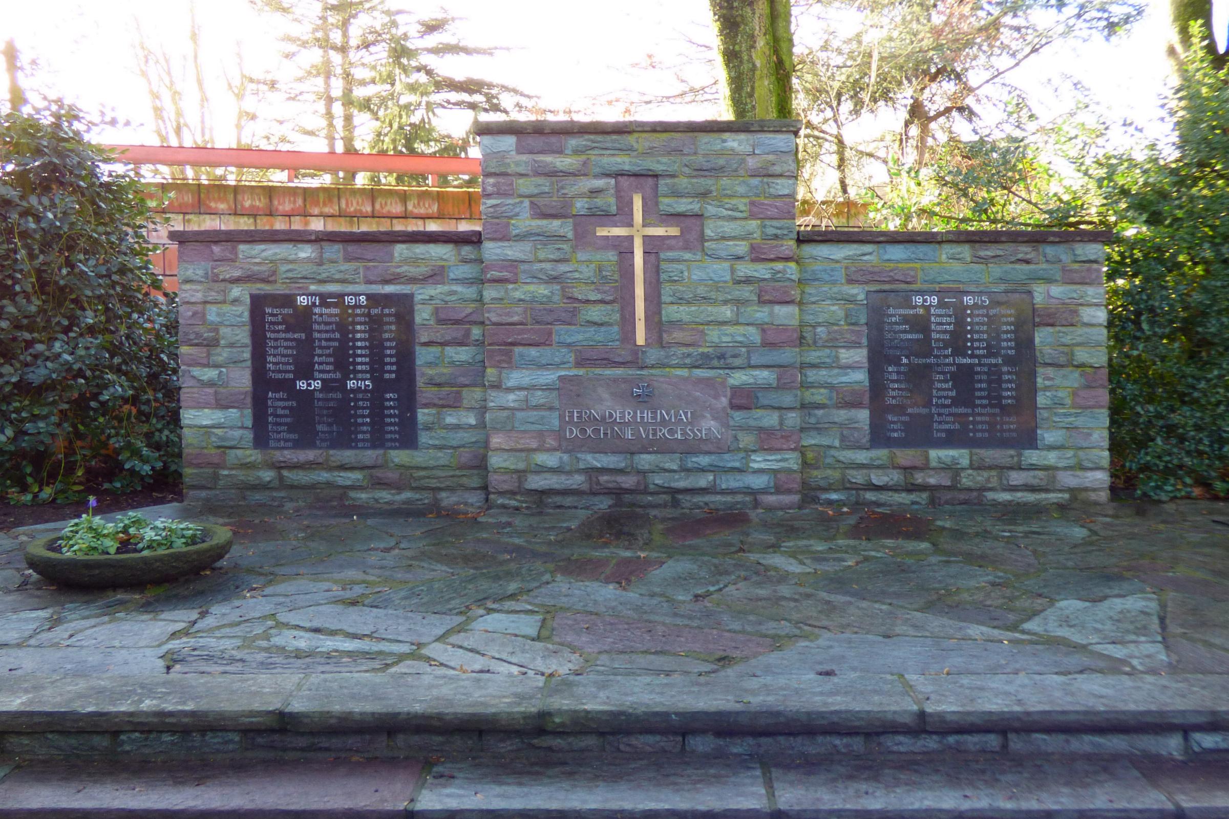 Standort: Das Ehrenmal befindet sich auf dem Friedhof in Houverath, in der Stadt Erkelenz. Das Ehrenmal ist Bestandteil der Friedhofanlage. Beschreibung: Bei der Anlage aus Schevenhütter Naturstein besteht aus einer Vorfläche, dem Ehrenmal und 3 Soldatengräber des 2. Weltkrieges. Das Ehrenmal ist dreigeteilt und in der Mitte 2,00 m hoch und insgesamt 4,50 m. breit. Auf den beiden Namenstafeln sind 30 Namen eingetragen. Das Mittelteil wird durch ein Eisenkreuz geprägt, das in einer kleinen Nische steht. Die Anlage wurde 1959 errichtet zum Zeichen treuen Gedenkens und als Mahnmal für die lebende und kommende Generation. Darunter die Inschrift: FERN DER HEIMAT DOCH NIE VERGESSEN Quellenhinweis: * Schriftenreihe des Heimatvereins der Erkelenzer Lande e.V. Nr. 17 Zeichen am Wege S. 244 von Paul Blaesen * Kriegsgräberstätte auf dem Friedhof in Houverath (Volksbund Deutsche Kriegsgräberfürsorge e.V.) * Gefallenendenkmäler in Houverath
