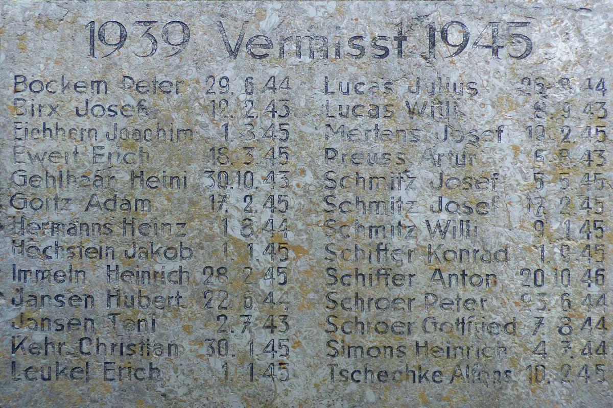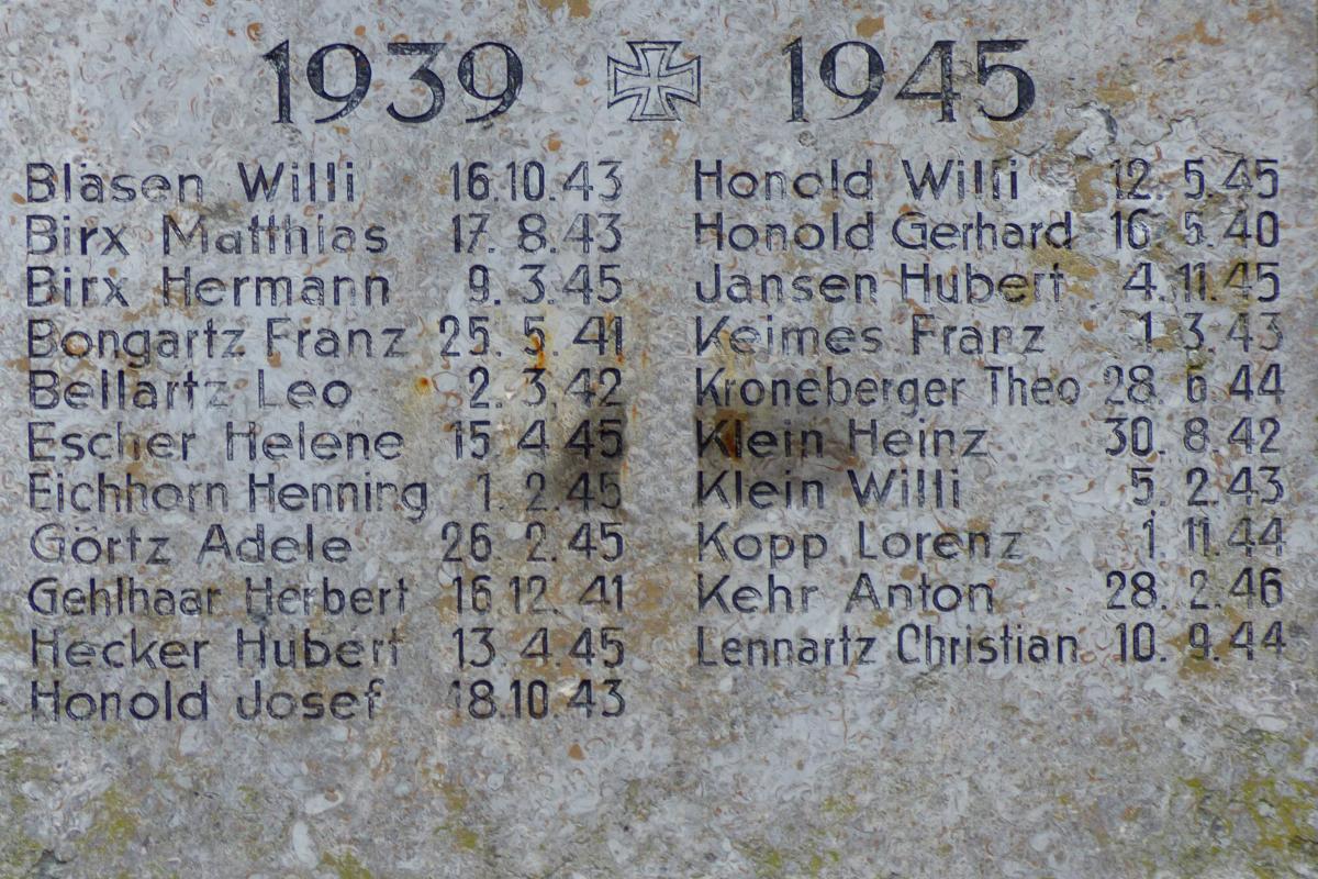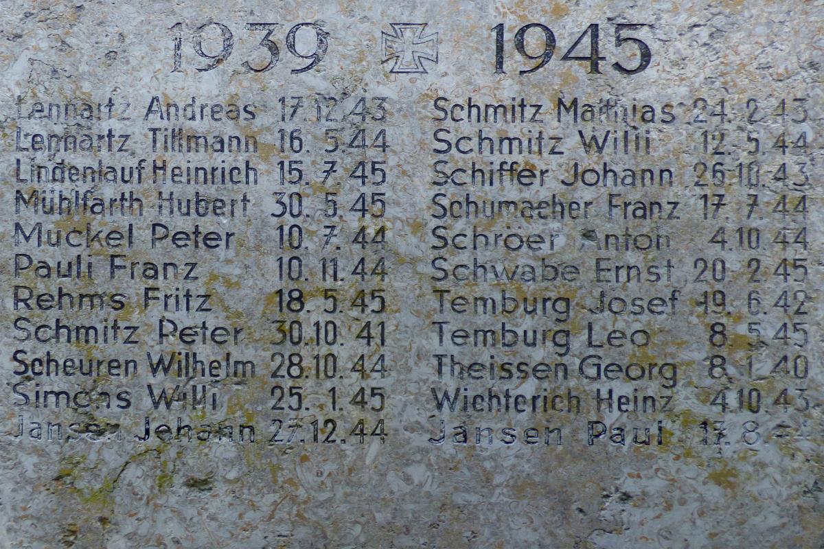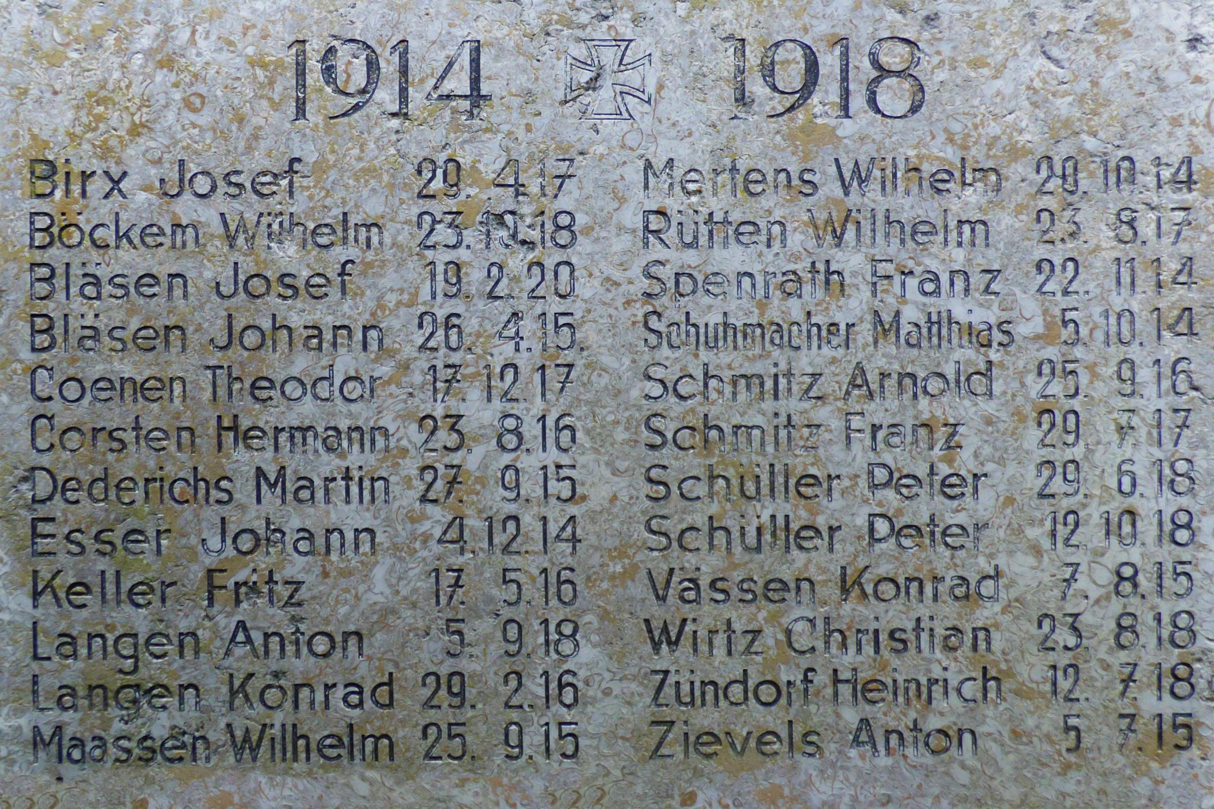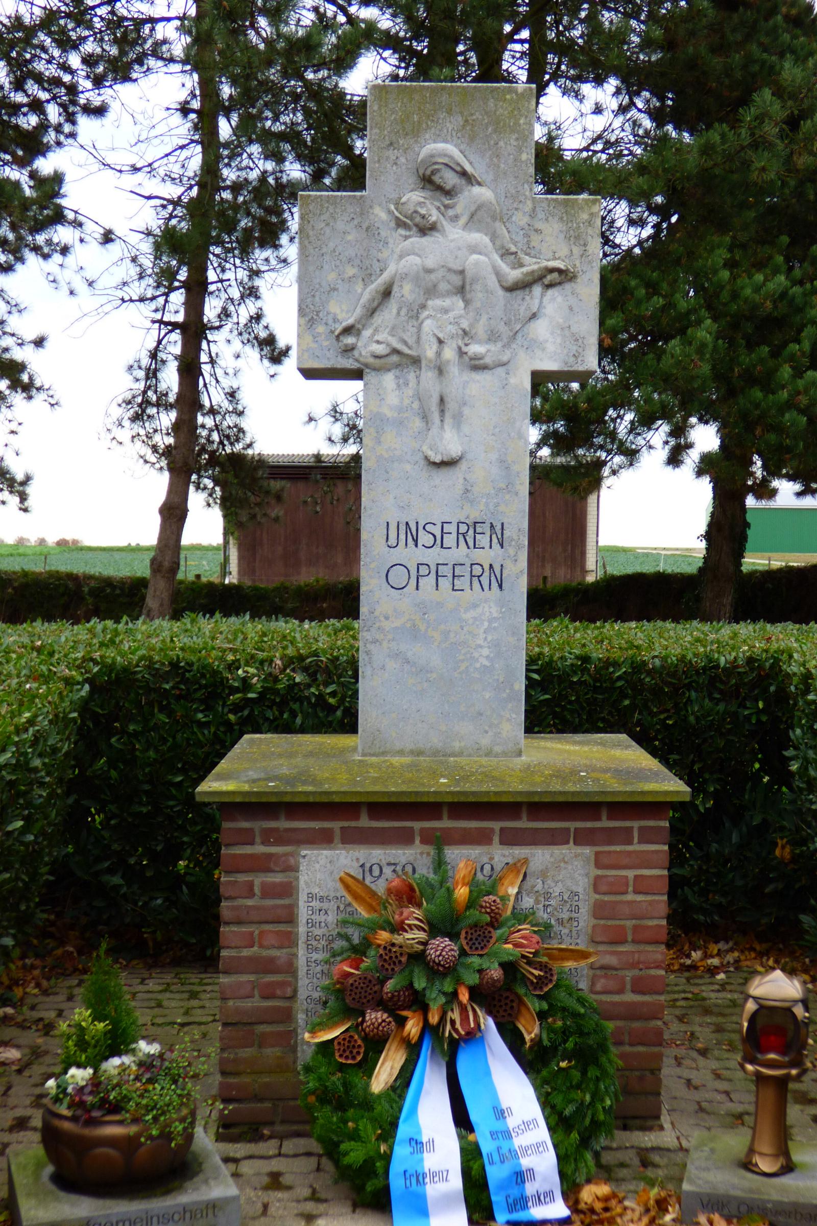 Standort: Das Ehrenmal hat seinen Standort auf dem Friedhof am Rainer - Langen - Weg in Katzem, in der Stadt Erkelenz. Das Ehrenmal ist Bestandteil der Friedhofanlage. Beschreibung: Bei dem Ehrenmal handelt es sich um eine Gedenkstätte für die gefallenen und vermißten Soldaten des Weltkrieges 1914 - 1918 und 1939 - 1945. Auf einem 1,35 m x 1,35 m großen gemauerten Steinsockel steht ein 1,90 m hohes Steinkreuz mit einer Pieta und der Schrift "Unseren Opfern". Die Pieta schuf die Werkstatt des Bildhauers Hermann WILMS aus Erkelenz.