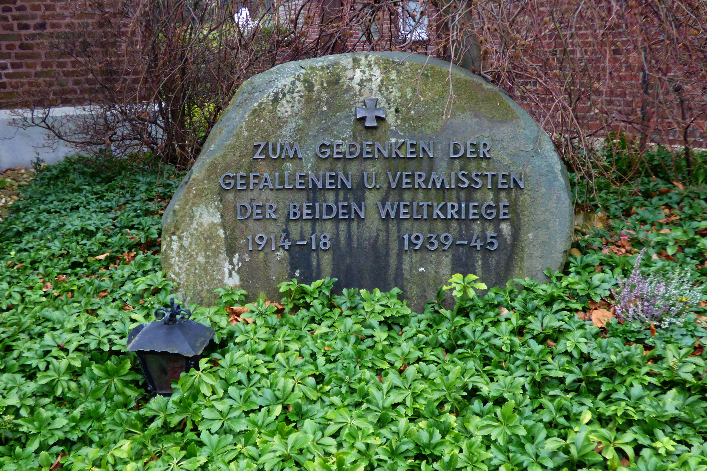 Der Gedenkstein wurde im Jahr1989 errichtet: ZUM GEDENKEN DER GEFALLENEN UND VERMISSTEN DER BEIDEN WELTKRIEGE 1914 - 1918 und 1939 - 1945 Quellenhinweis: * Schriftenreihe des Heimatvereins der Erkelenzer Lande e.V. Nr. 17 Zeichen am Wege S. 106 von Paul Blaesen
