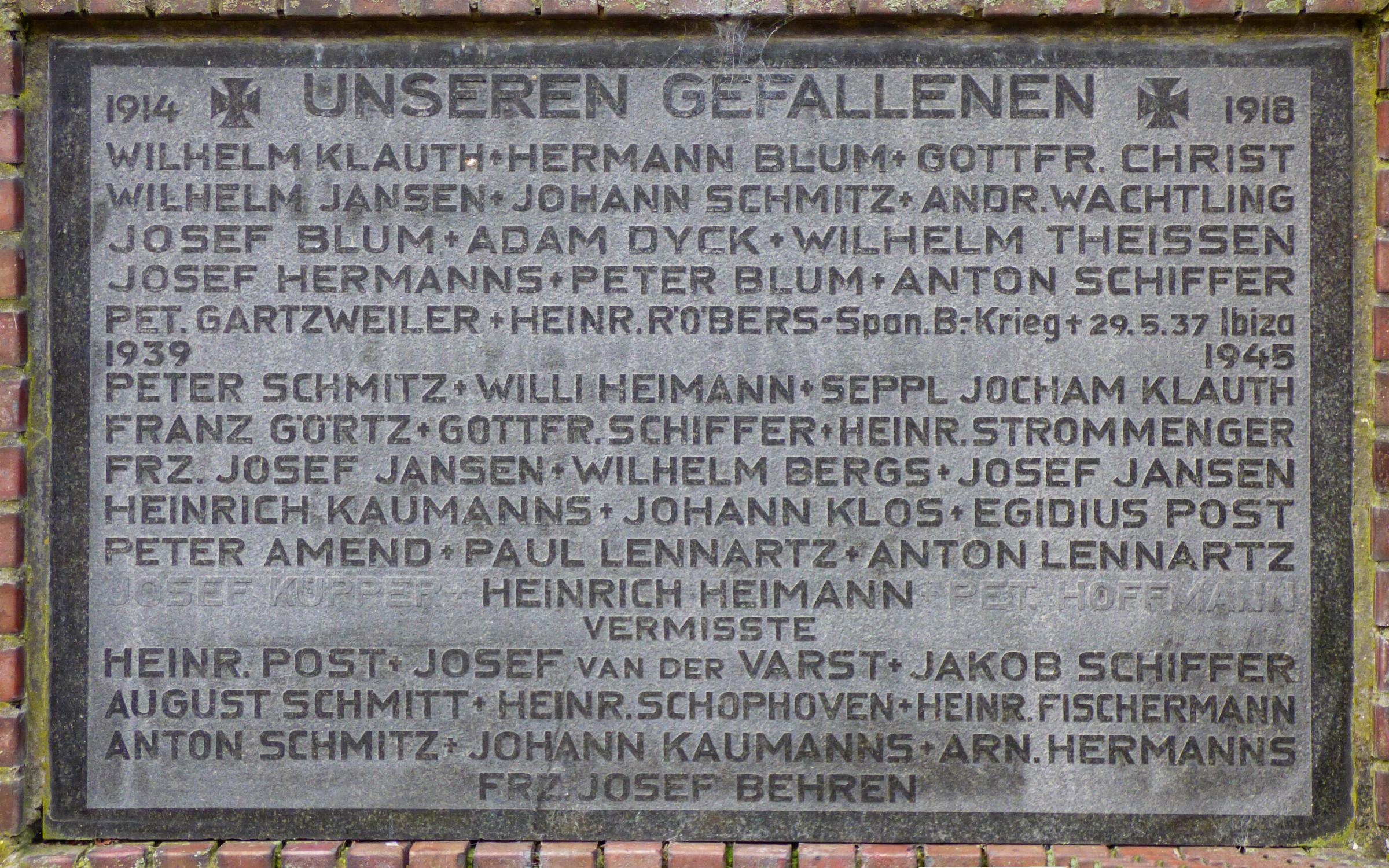 Beschreibung: Auf einem Steinsockel befindet sich ein Findling (Trachyt) darüber eine Kugel mit einem Kreuz. Der Sockel hat eine Höhe von 1,20 m, eine Breite von 1,70 m und eine Tiefe von 0,37 m. Die Inschrift: UNSEREN GEFALLENEN. Auf der Inschrifttafel sind die 40 Namen der Opfer von Kriegen eingetragen, darunter 13 vom 1. Weltkrieg, 1 vom spanischen Bürgerkrieg und 26 von 2. Weltkrieg. Die Anlage wurde 1952 eingeweiht. Quellenhinweis: * Schriftenreihe des Heimatvereins der Erkelenzer Lande e.V. Nr. 17 Zeichen am Wege S. 190 von Paul Blaesen. * Gefallenendenkmal und Ehrenmal in Kuckum