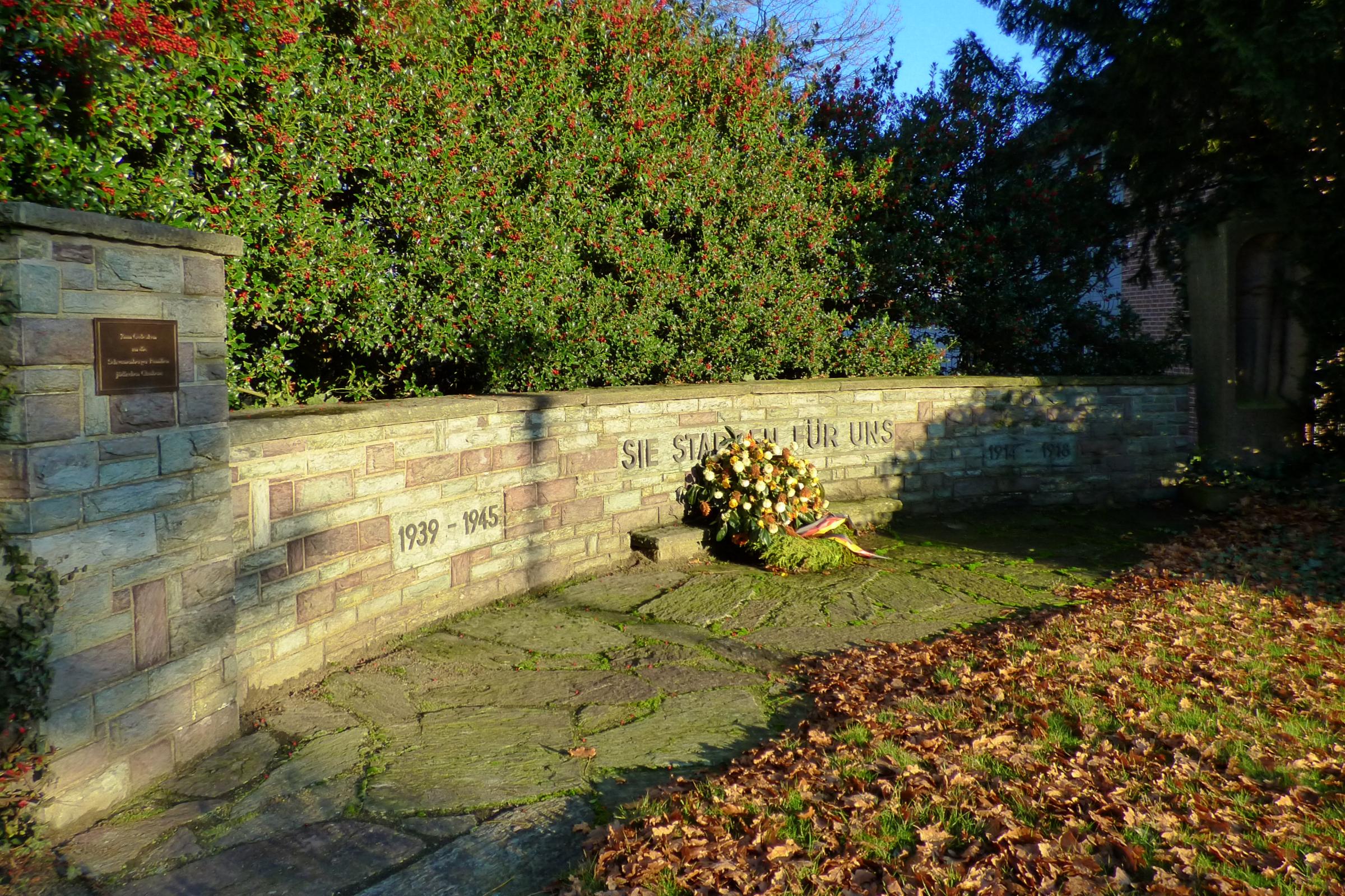 Standort: Die Gedenktafel an die Schwanenberger Familien jüdischen Glaubens befindet sich am Ehrenmal an der Evangelischen Kirche in Schwanenberg, in der Stadt Erkelenz. Beschreibung: Bei dem Ehrenmal handelt es sich um ein halbrundes Denkmal aus Schevenhütter Bruchstein. Bereits 1924 wurde an der Evang. Kirche in Schwanenberg ein Ehrenmal errichtet, das im Jahre 1960 in seine jetzige Form umgebaut wurde. Das Ehrenmal hat eine Breite von 7,90 m. An der linken Seite steht ein gemauerter Pfeiler mit einer Bronzetafel: Zum Gedenken an die Schwanenberger Familien jüdischen Glaubens. An der rechten Seite steht ein 2,45 m hoher Gedenkstein, der in einen eingemeißelter offenen Sarg - einen Soldaten der ein Schwert in Händen hält - zeigt. Im unteren Bereich des Sarkophag steht die Inschrift: IHREN SÖHNEN IN DANKBARKEIT ANNO 1922 GEMEINDEVERWALTUNG SCHWANENBERG In der Gemeinde Schwanenberg waren im Ersten Weltkrieg 40 Kriegsopfer, im Zweiten Weltkrieg 64 Opfer zu beklagen. Das Ehrenmal trägt die Inschrift: S I E S T A R B E N F Ü R U N S 1914 - 1918 1939 - 1945 Quellenhinweis: * Schriftenreihe des Heimatvereins der Erkelenzer Lande e.V. Nr. 17 Zeichen am Wege S. 271 von Paul Blaesen