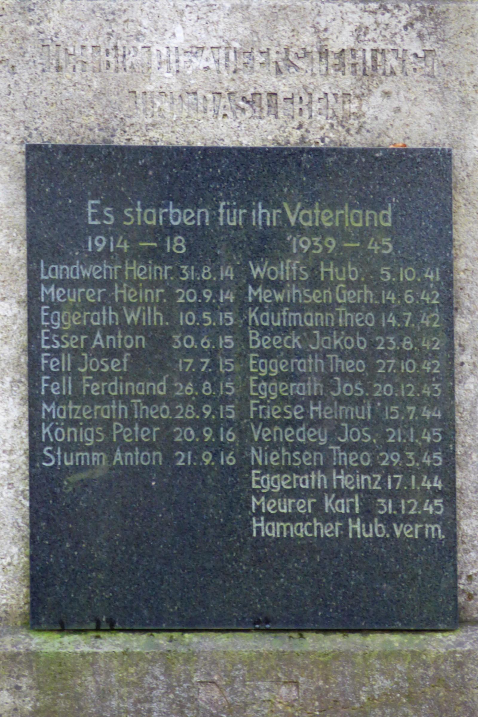 Standort: Das Ehrenmal hat seinen Standort an der nördlichen Seite der Kirche in Tenholt, in der Stadt Erkelenz. Beschreibung: Bei dem Ehrenmal handelt es sich um ein Gedenkkreuz aus Kalksandstein mit einer Höhe von 3,00 m und einer Breite von 0,76 m. Im mittleren Teil des Kreuzes ist eine Marmortafel angebracht mit den Namen der gefallenen Soldaten beider Weltkriege. Oberhalb der Marmortafel die Inschrift: ICH BIN DIE AUFERSTEHUNG UND DAS LEBEN Auf der Marmortafel Es starben für das Vaterland 1914 - 1918 1939 - 1945
