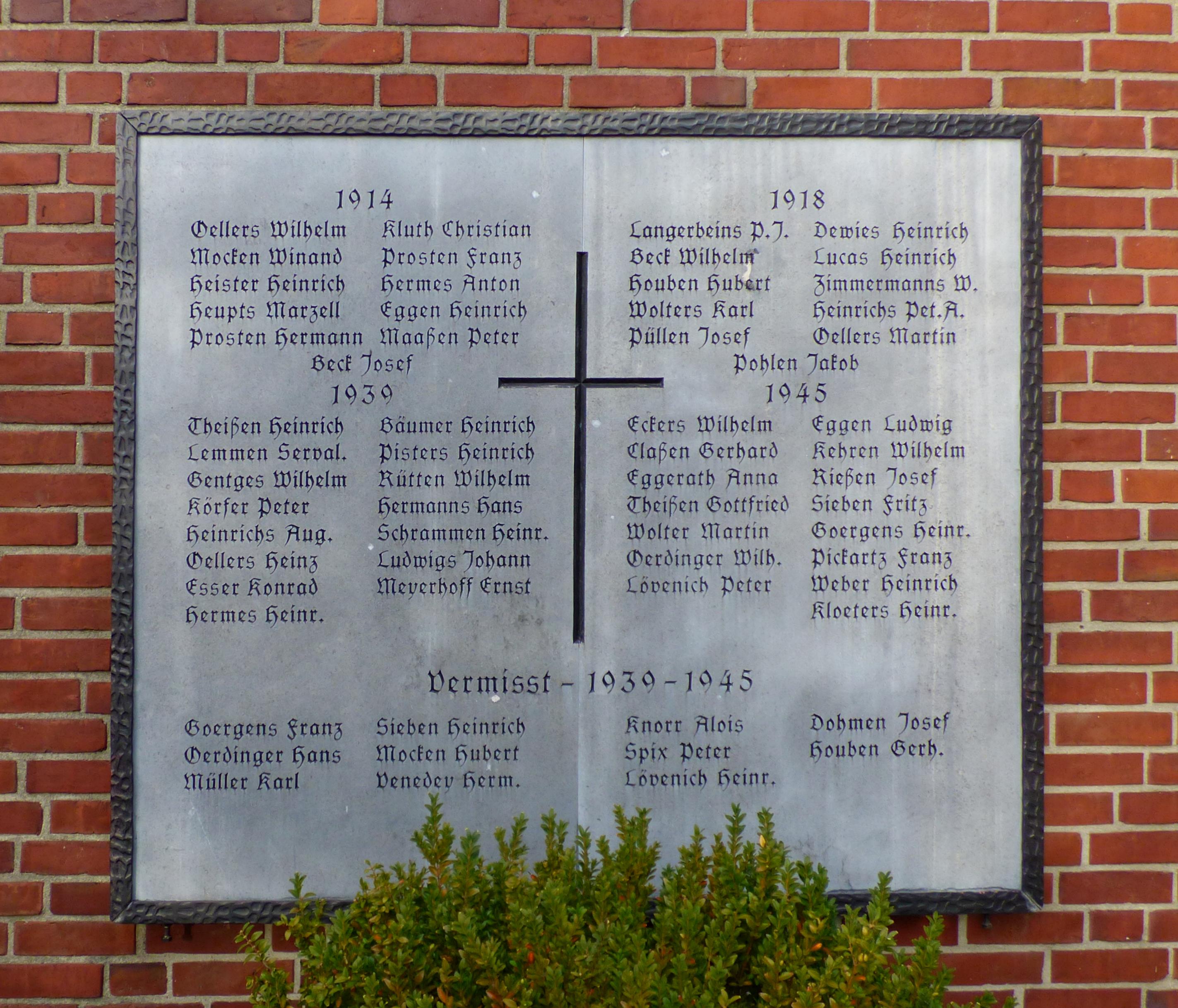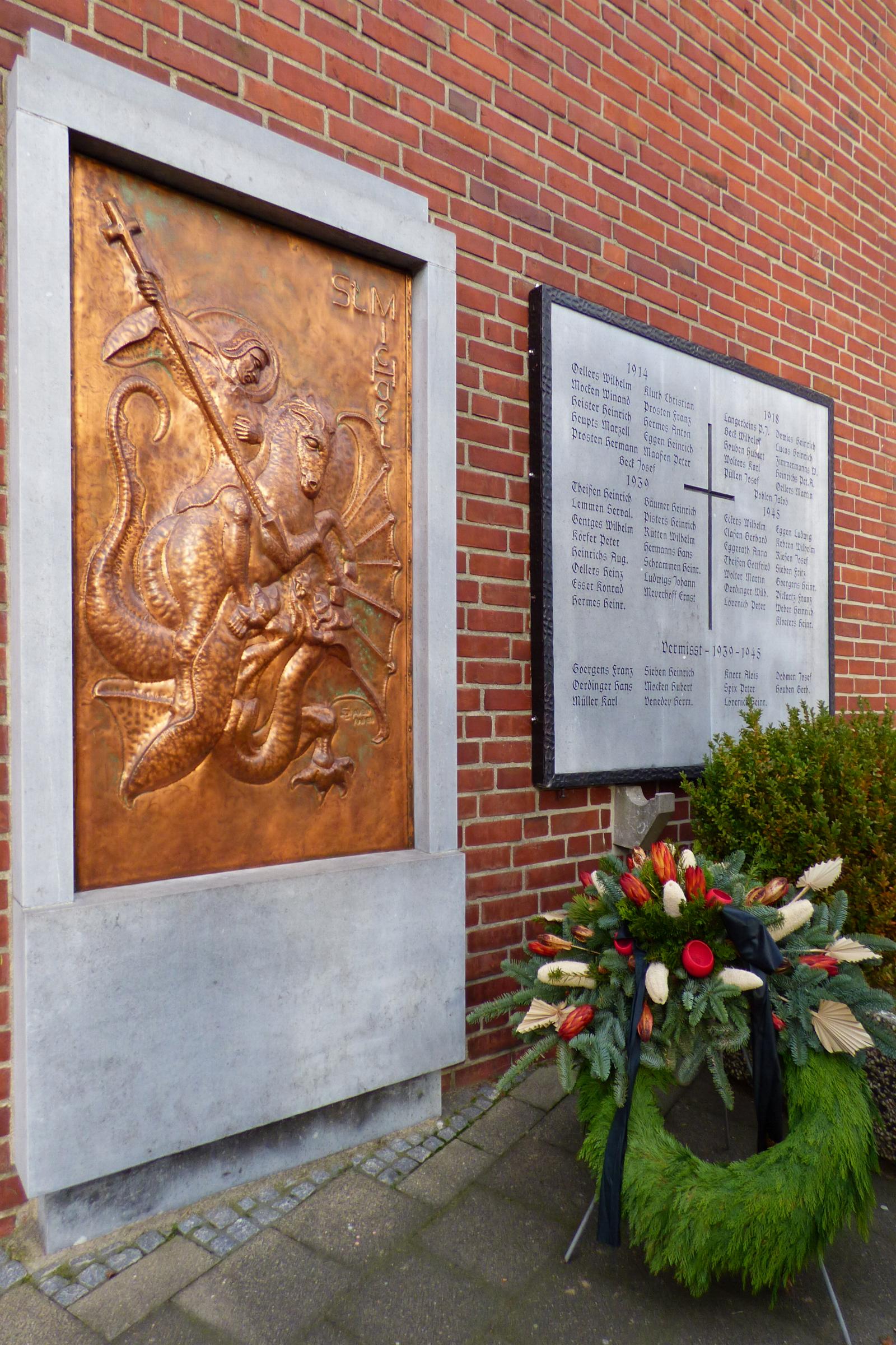 Standort: Das Wandbild des Hl. Michael und die Namenstafel der Verstorbenen der beiden Weltkriege bilden zusammen das Ehrenmal und haben ihren Standort an der Kirche im Ortsteil Terheeg, in der Stadt Erkelenz. Das Ehrenmal wurde 1960 errichtet. Beschreibung: Bei dem Wandbild handelt es sich um ein Relief des St. Michael, der den Drachen tötet. Das Wandbild hat eine Höhe von 2,40 m die Breite 1,20 m. In Nachbarschaft des Reliefs hängt eine Namenstafel mit den Namen der 22 Opfer des 1. Weltkrieges und 41 Opfer des 2. Weltkrieges aus den Ortschaften Terheeg, Wockerath und Mennekrath. Sie hat eine Höhe von 1,50 m und eine Breite von 1,80 m. Quellenhinweis: * Schriftenreihe des Heimatvereins der Erkelenzer Lande e.V. Nr. 17 Zeichen am Wege S. 71 von Paul Blaesen