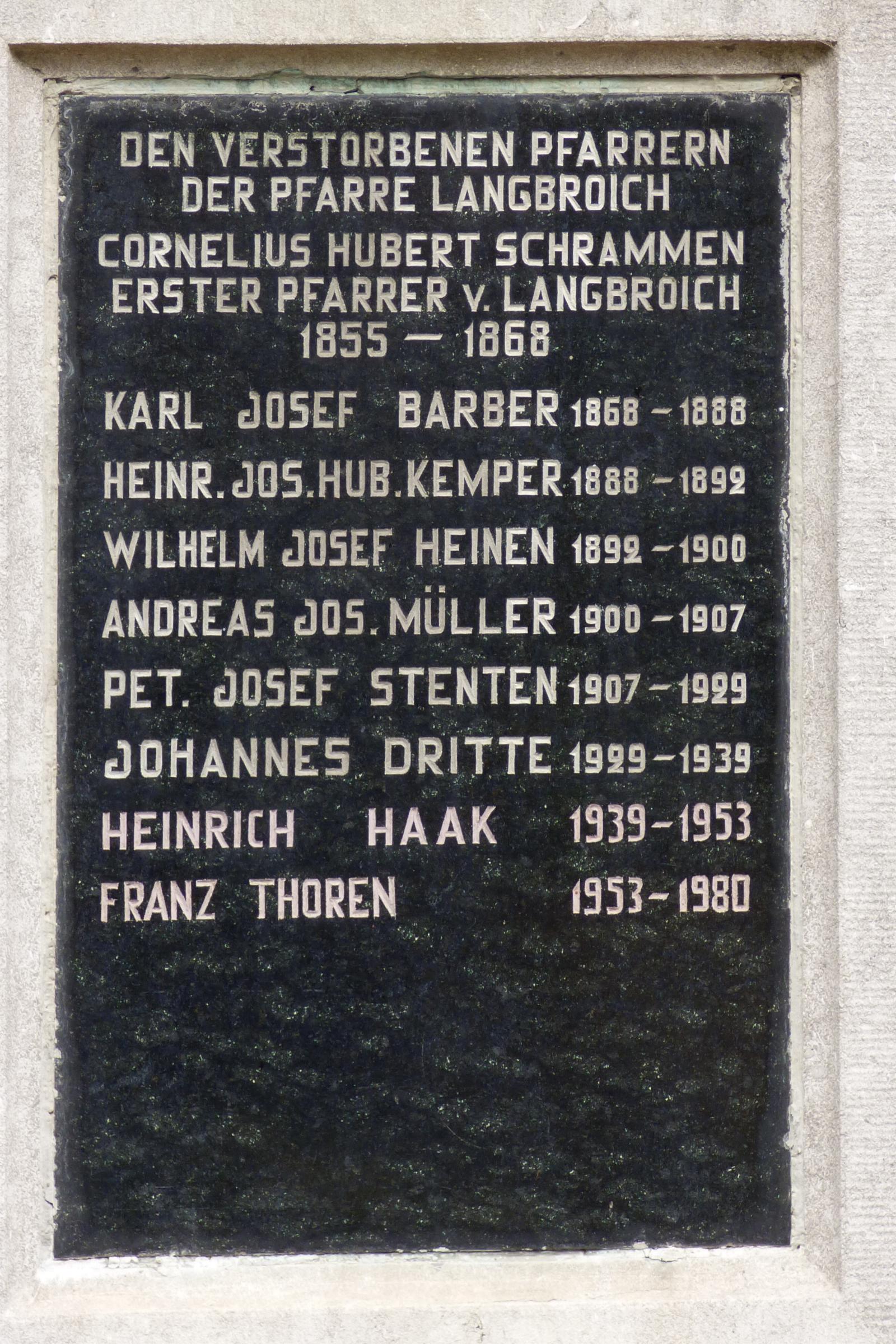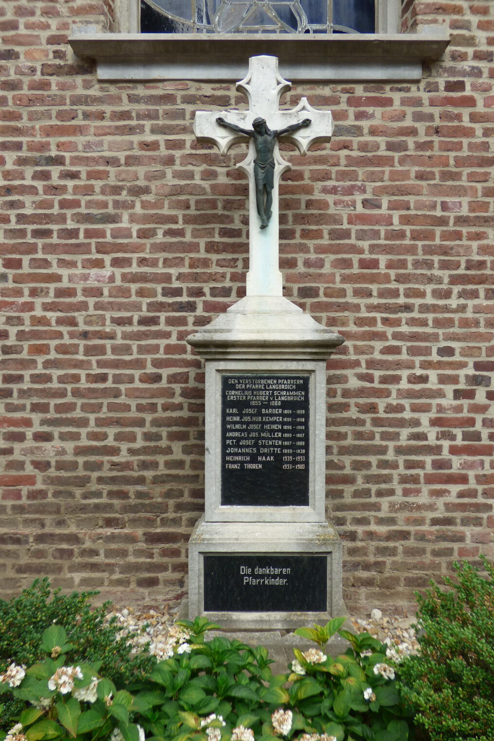Standort: Das Hist. Priestergedenkkreuz hat seinen Standort an der Nordostseite der Kirche, im Ortsteil Langbroich, in der Gemeinde Gangelt. Geschichte: Bei dem Hist. Priestergedenkkreuz handelt es sich um ein ca. 2,80 m hohes Steinkreuz mit einem Metallkorpus. Im Mittelteil des Kreuzes befindet sich eine Steintafel mit den Namen der Pfarrer der Pfarre Langbroich. Eine Inschrift auf der unteren Tafel lautet: Die dankbaren Pfarrkinder