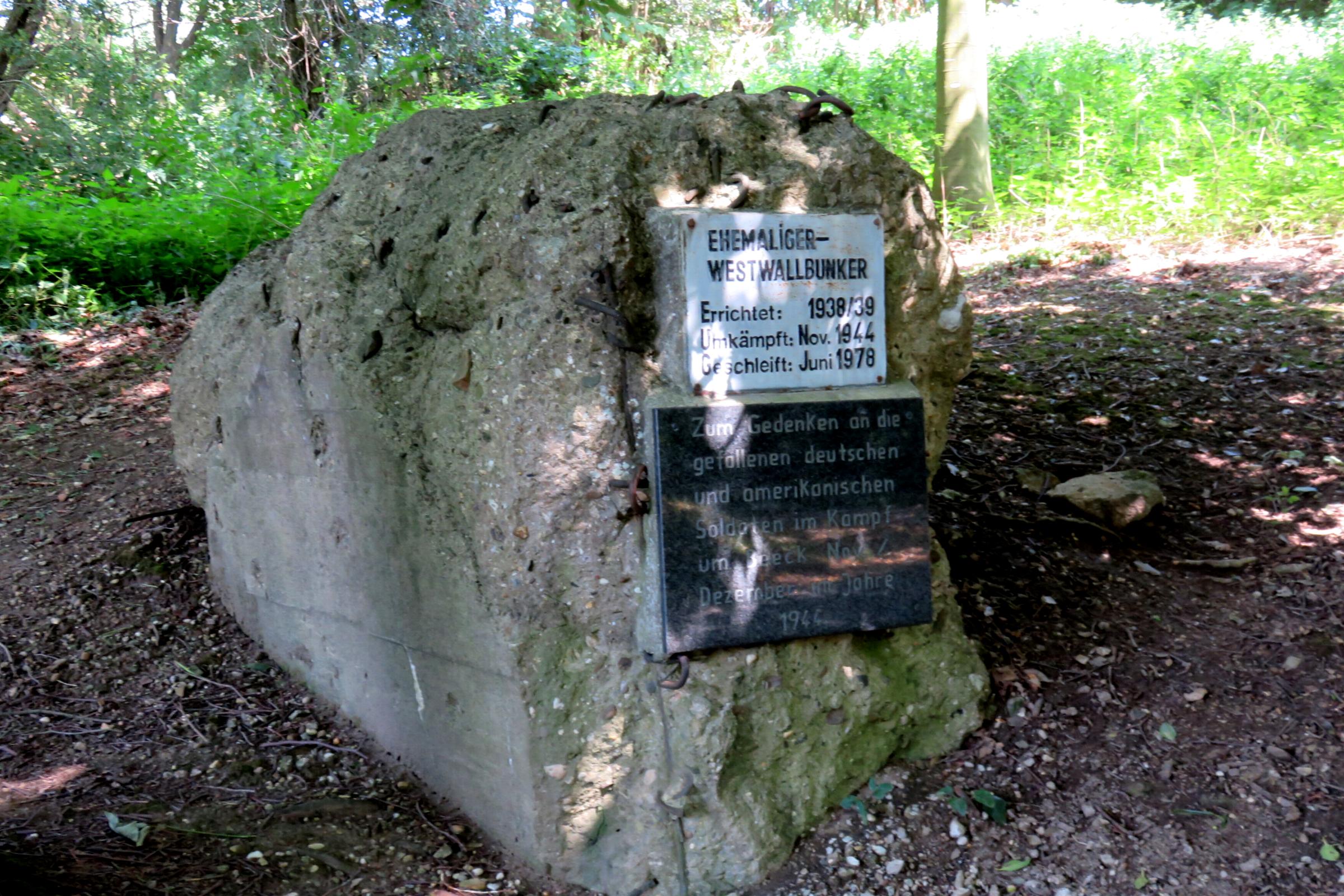 Standort: Das Denkmal eines Ehemaligen - Westwallbunkers befindet sich am Gereonsweiler Fließ, in der Gemarkung Schlackenberg, im Stadtteil Beeck, in der Stadt Geilenkirchen. Beschreibung: Bei dem Denkmal handelt es sich um den Rest eines Ehemaligen - Westwallbunkers. Auf den Betonrest sind 2 Tafeln angebracht. Tafel 1: Ehemaliger - Westwallbunker, Errichtet: 1938/39, Umkämpft: Nov. 1944, geschleift: Juni 1978 Tafel 2: Zum Gedenken an die gefallenen deutschen und amerikanischen Soldaten im Kampf um Beeck November / Dezember im Jahre 1944