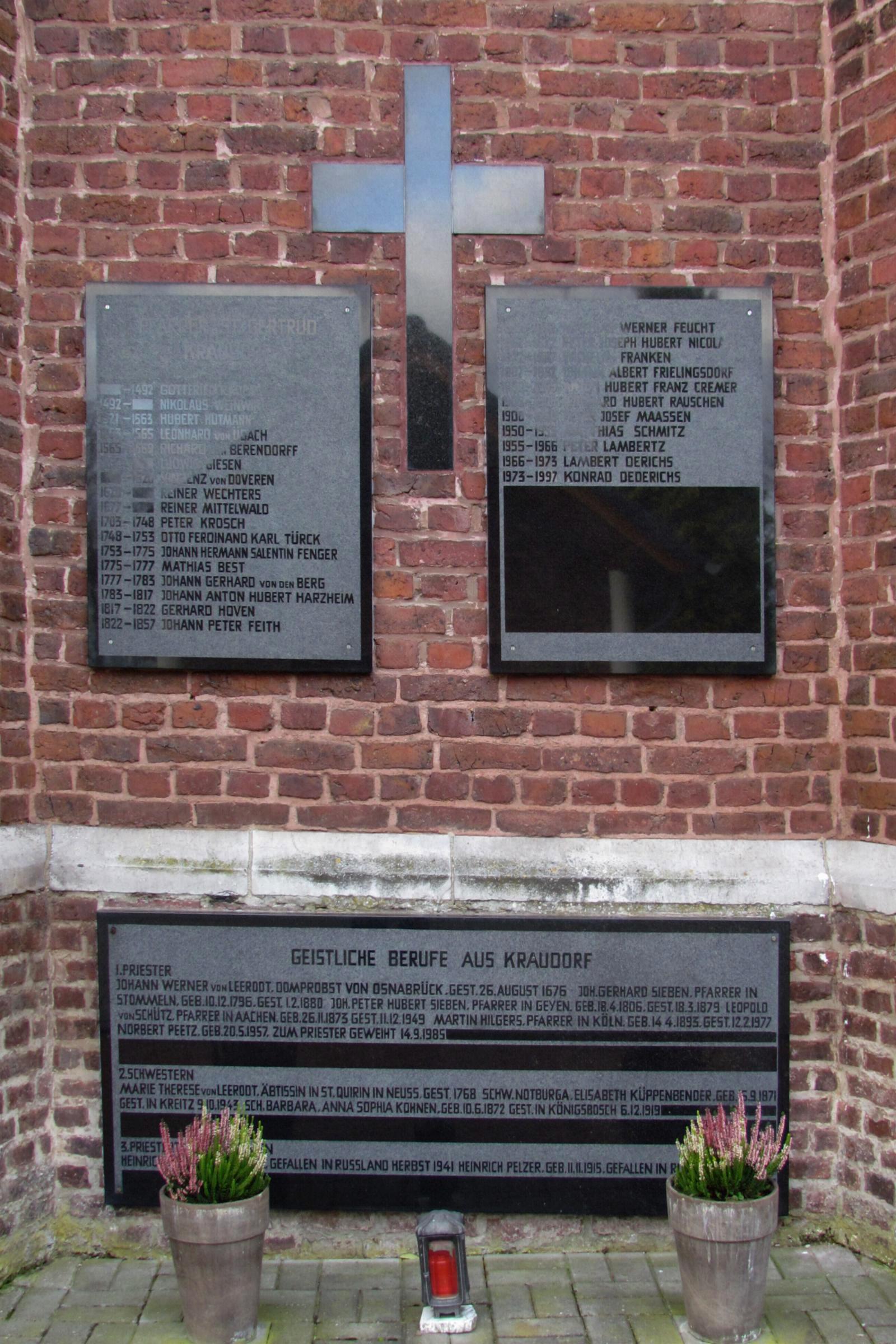 Standort: Die Gedenktafeln der Priester und geistlichen Berufe befindet sich an der Kirche St. Gertrud, im Stadtteil Kraudorf, in der Stadt Geilenkirchen. Beschreibung: An der Kirche St. Gertrud in Kraudorf befinden sich mehrere Gedenktafeln und ein Kreuz aus schwarzen Marmor. Hierauf sind die Namen der Priester und der Personen mit geistlichen Berufen zu lesen. Der Zeitraum der Aufzeichnung beginnt im Jahr 1492 und endet im Jahr 1997. Die Gedenktafeln sind Bestandteil der Friedhofanlage