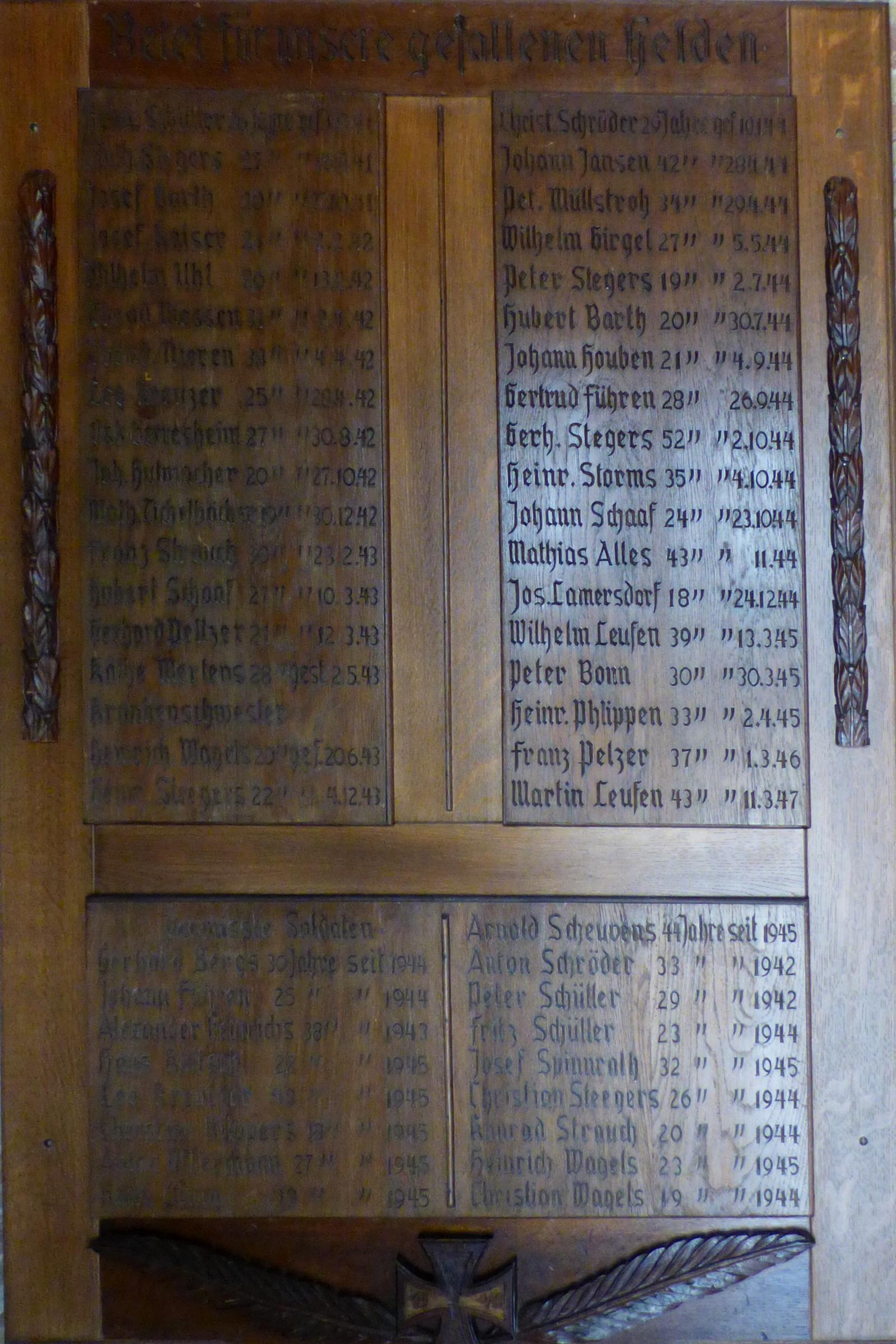 Standort: Die Ehrentafel befindet sich in der Beerdigungskapelle an der Kirche, im Stadtteil Prummern, in der Stadt Geilenkirchen. Beschreibung: Die Ehrentafel in Prummern wurde zu Ehren der Gefallenen und der Vermißten des Zweiten Weltkrieges errichtet. Sie soll den Überlebenden zur Mahnung und den Verstorbenen zur Ehre dienen.