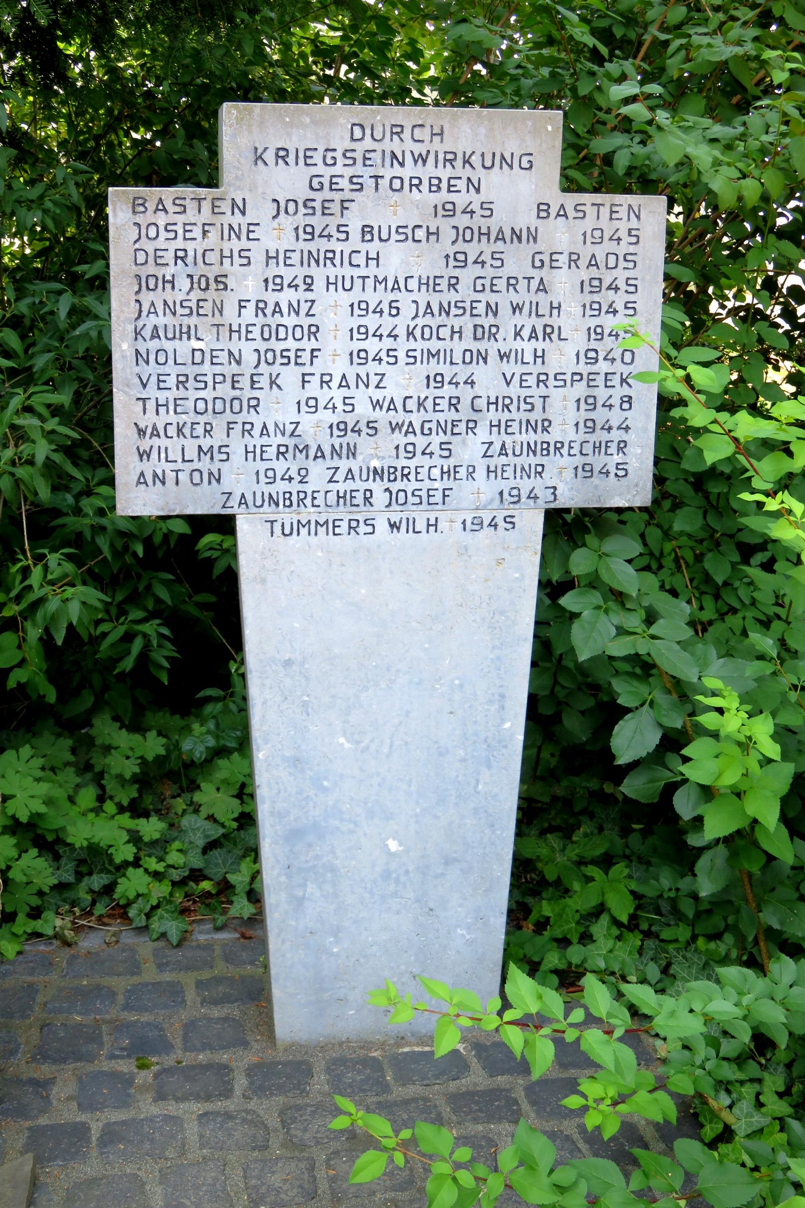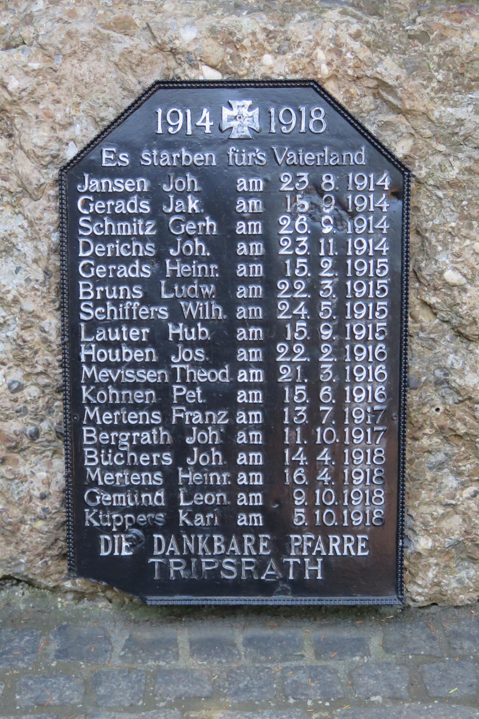 Standort: Das Ehrenmal befindet sich auf dem Friedhof an der Pfarrer Holzberg Straße 12, im Stadtteil Tripsrath, in der Stadt Geilenkirchen. Beschreibung: Das Ehrenmal in Tripsrath wurde zu Ehren der Gefallenen und der Vermißten des Ersten und Zweiten Weltkrieges errichtet. Es soll den Überlebenden zur Mahnung und den Verstorbenen zur Ehre dienen. Die Inschrift lautet: DIE TOTEN VERPFLICHTEN DIE LEBENDEN Die Dankbare Pfarre Tripsrath Quellenhinweis: * Gefallenendenkmal in Tripsrath (Onlineobjekt Gefallenendenkmäler)