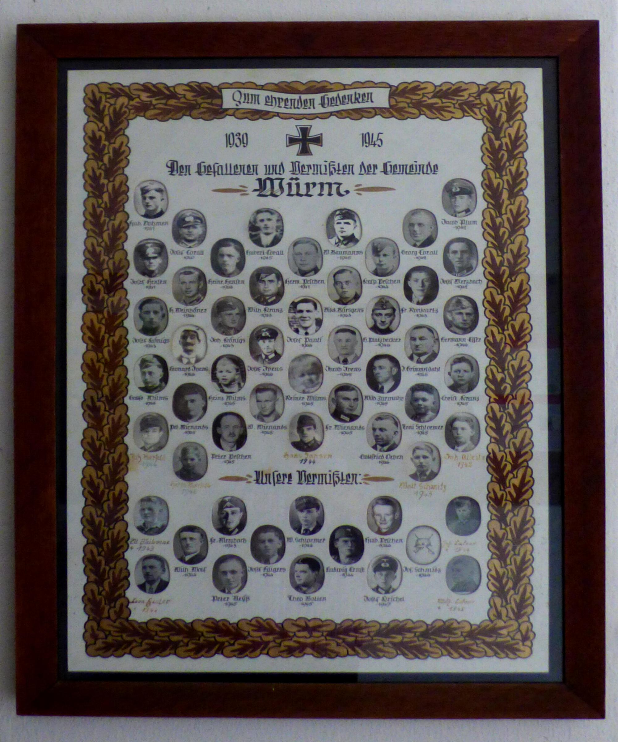 Standort: Die Ehrentafel befindet sich an der Kirche, im Stadtteil Würm, in der Stadt Geilenkirchen. Beschreibung: Das Ehrenmal in Würm wurde zu Ehren der Gefallenen und der Vermißten des Zweiten Weltkrieges errichtet. Es soll den Überlebenden zur Mahnung und den Verstorbenen zur Ehre dienen. Die Inschrift lautet: Z U M E H R E N D E N G E D E N K E N Quellenhinweis: * Kriegsgräberstätte in Würm (Volksbund Deutsche Kriegsgräberfürsorge e.V.) * Gefallenendenkmal in Würm (Onlineobjekt Gefallenendenkmäler)