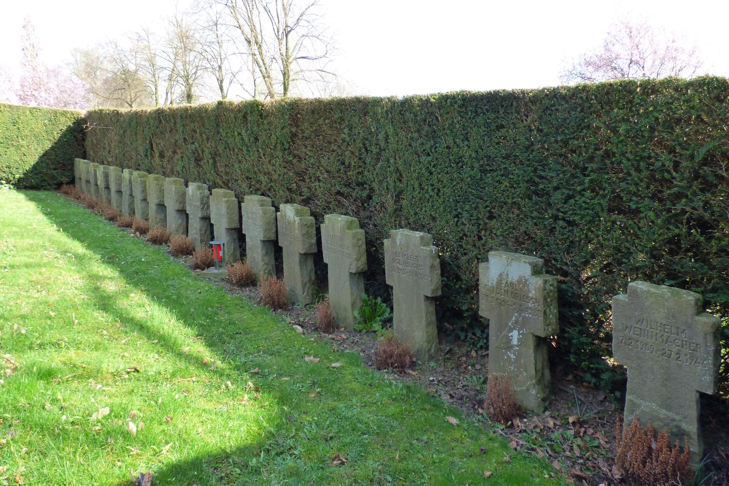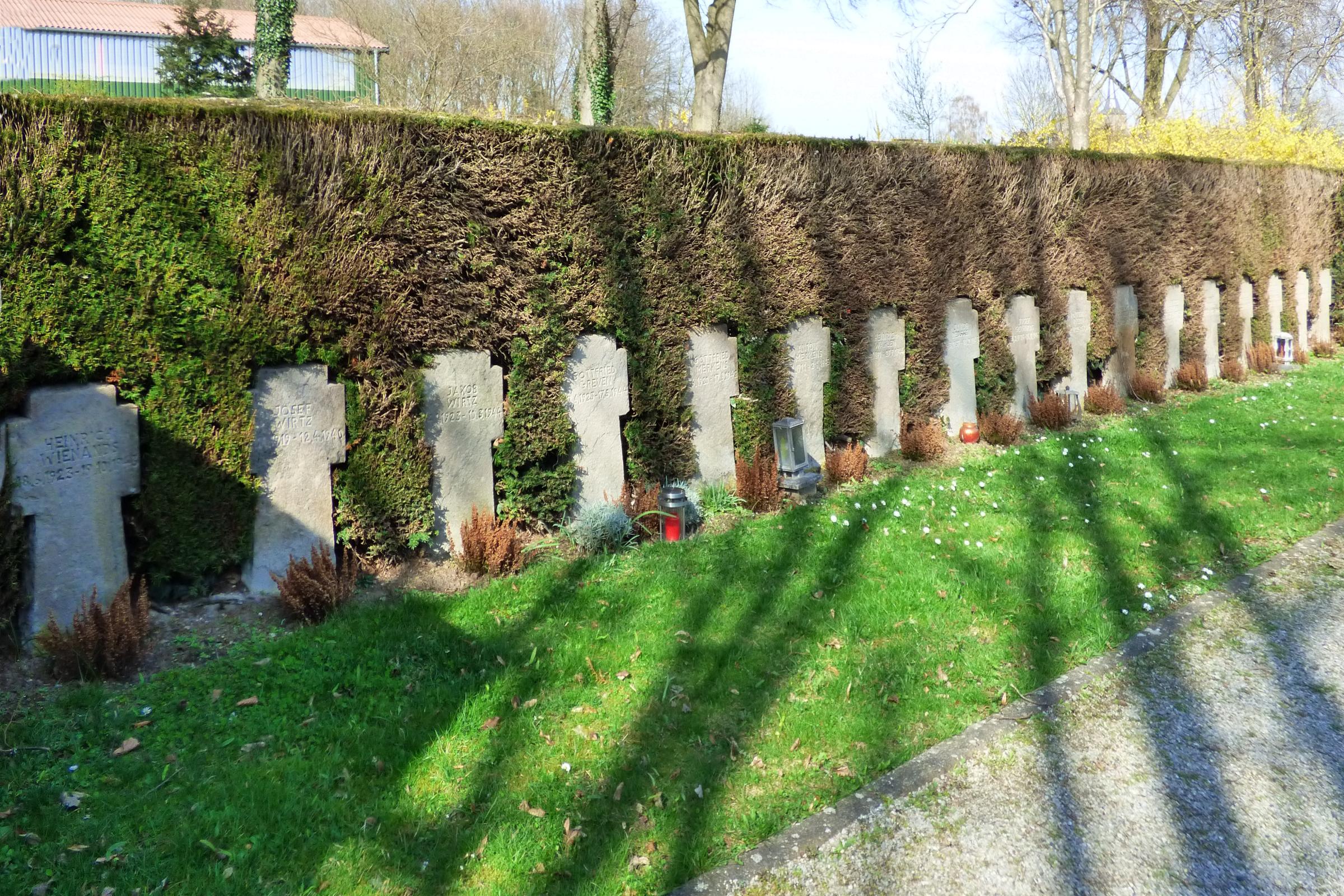 Standort: Der Ehrenfriedhof befindet sich auf dem Friedhof an der Glockenlandstraße, im Stadtteil Dremmen in der Stadt Heinsberg. Er ist Bestandteil der Friedhofanlage Beschreibung: Auf dem Ehrenfriedhof stehen in zwei Grabreihen 31 Grabkreuze von 30 deutschen und 1 niederländischer Kriegstoten des Ersten (9 Tote) und Zweiten Weltkrieges (22 Tote), die hier ihre letzte Ruhe fanden. Quellenhinweis * Kriegsgräberstätte in Dremmen (Volksbund Deutsche Kriegsgräberfürsorge e.V.) * Gefallenendenkmäler in Dremmen (Onlineobjekt Gefallenendenkmäler)