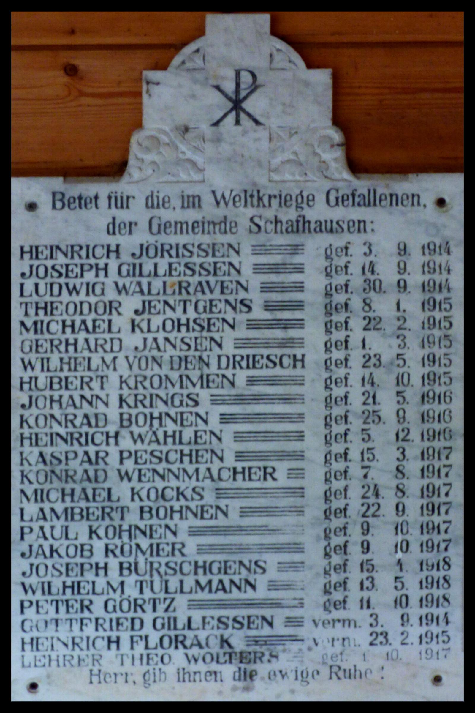 Standort: Die Ehrentafel 1914 - 1918 der Gemeinde Schafhausen befindet sich im Ehrenpavillon auf dem Friedhof am Engelsberg, im Stadtteil Schafhausen, in der Stadt Heinsberg. Die Ehrentafel ist Bestandteil der Friedhofanlage. Beschreibung: Die Ehrentafel der Gemeinde Schafhausen wurde zu Ehren der Gefallenen des Weltkrieges 1914 - 1918 errichtet. Sie soll den Überlebenden zur Mahnung und den Verstorbenen zur Ehre dienen.