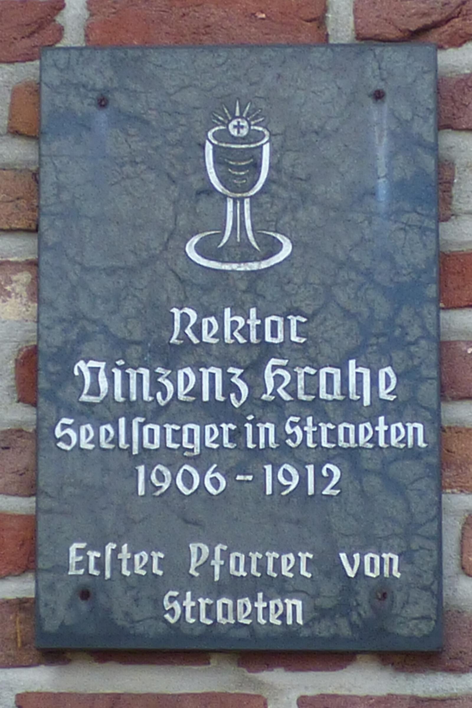 Standort: Die Gedenktafel hängt an der Rückseite der Kirche an der Römerstraße in Straeten, in der Stadt Heinsberg. Beschreibung: Die Gedenktafel erinnert an den Rektor und ersten Pfarrer Vinzenz Krahe in Straeten. Er war von 1906 - 1912 Seelsorger in Straeten.