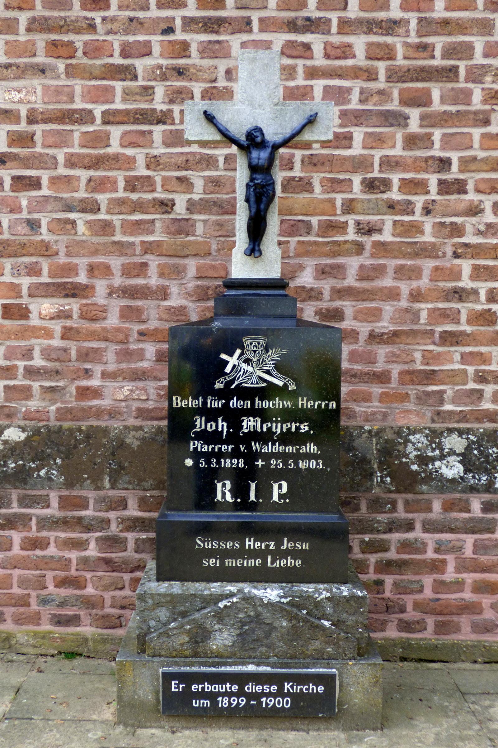 Standort: Das Gedenkkreuz hat seinen Standort an der Pfarrkirche in Waldenrath, in der Stadt Heinsberg. Beschreibung: Bei dem Gedenkkreuz handelt es sich um ein ca 2,50 m hohes Steinkreuz mit einem Metallkorpus. Das Kreuz trägt die Inschriften: Süsses Herz Jesu sei meine Liebe. Betet für den hochw. Herrn Joh. Meyers Pfarrer v. Waldenrath * 5.3.1828 + 25.5.1903 R. I. P. Er erbaute diese Kirche um 1899 - 1900