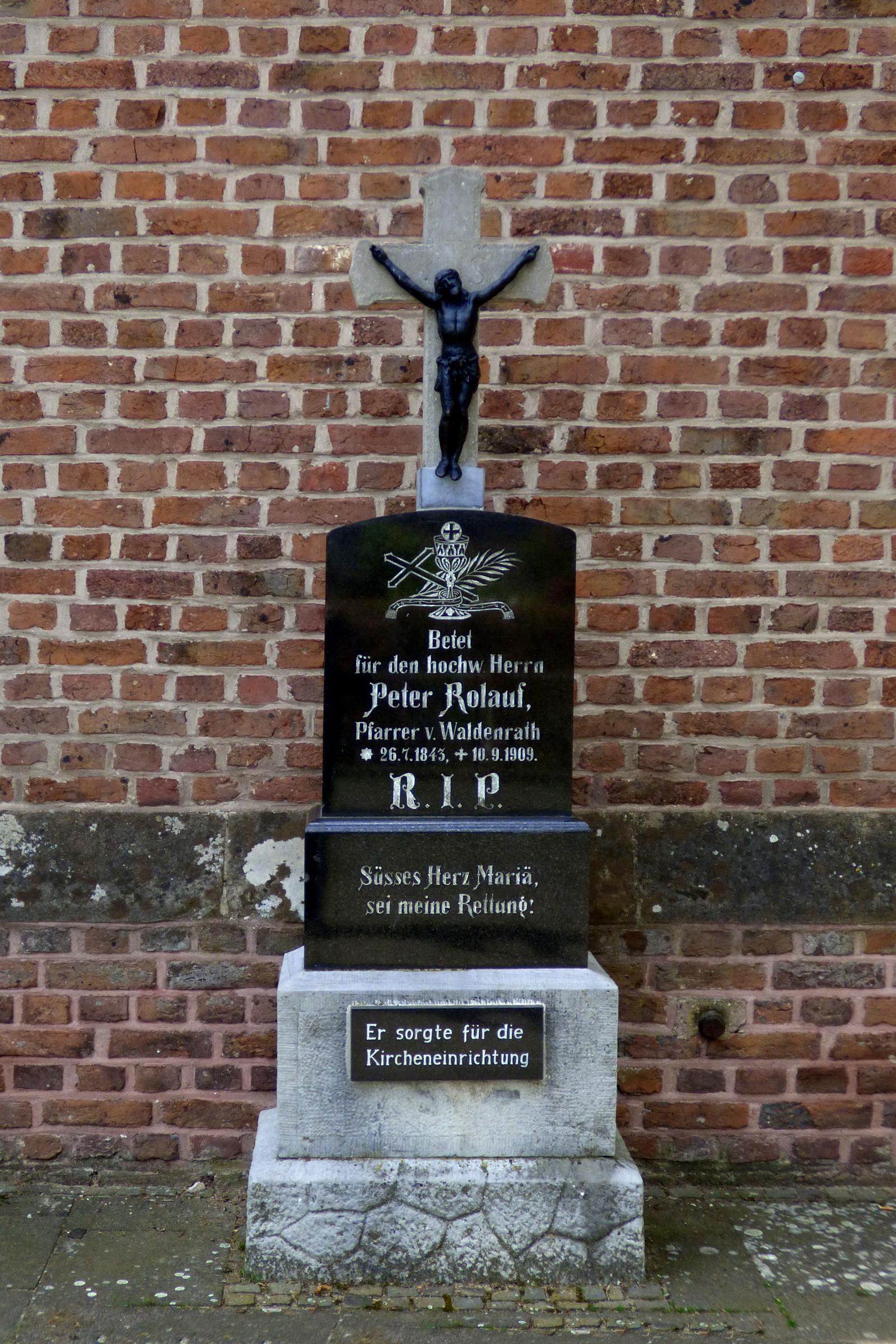 Standort: Das Gedenkkreuz hat seinen Standort an der Pfarrkirche in Waldenrath, in der Stadt Heinsberg. Beschreibung: Bei dem Gedenkkreuz handelt es sich um ein ca 2,50 m hohes Steinkreuz mit einem Metallkorpus. Das Kreuz trägt die Inschriften: Süsses Herz Mariä sei meine Rettung. Betet für den hochw. Herrn Peter Rolauf Pfarrer v. Waldenrath * 26.7.1843 + 10.9.1909 R. I. P. Er sorgte für die Kircheneinrichtung