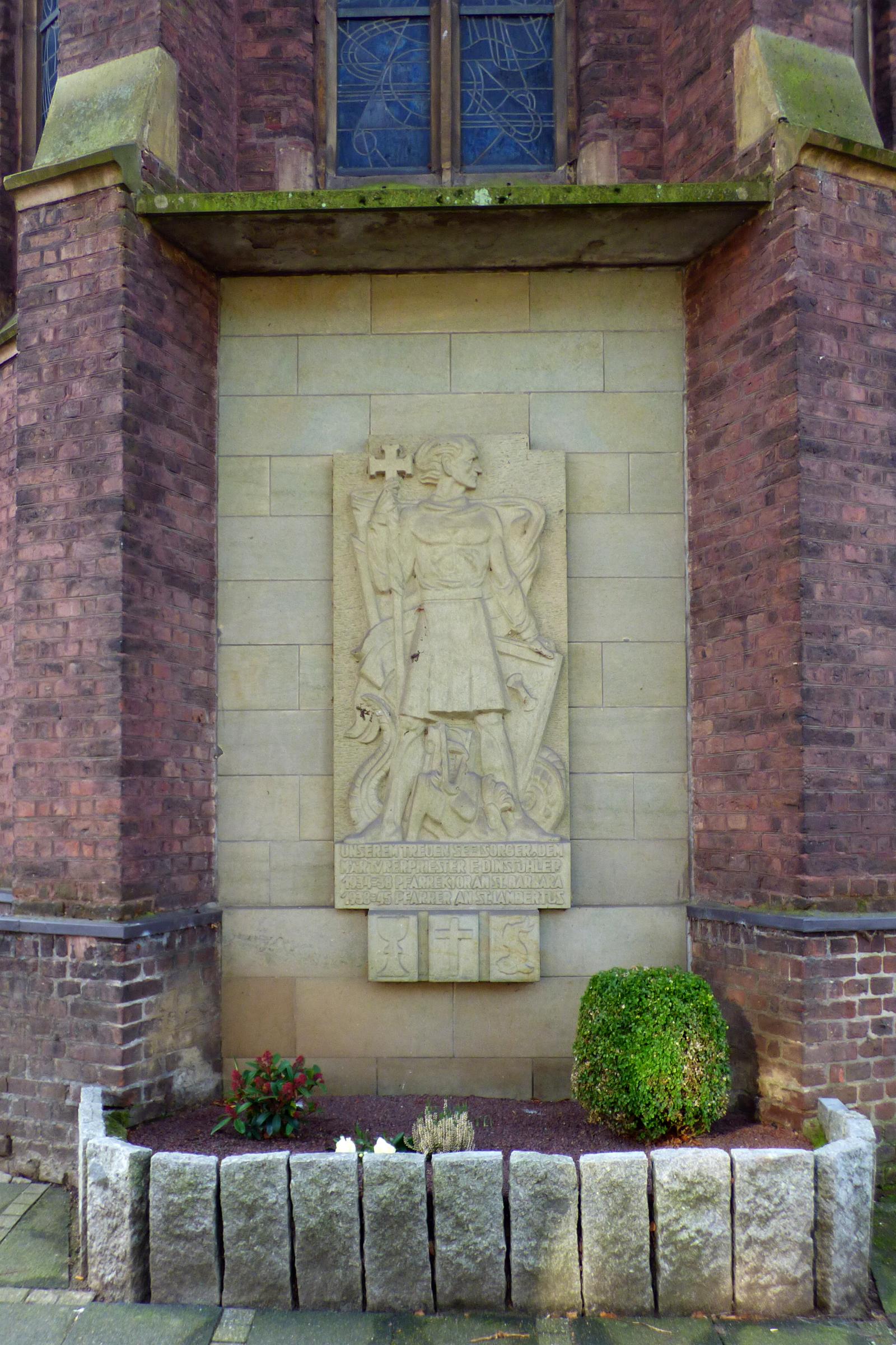 Standort: Die Gedenkplatte hat ihren Standort in einer Mauernische an der Kirche St. Lambertus an der Dinstühlerstraße, in der Stadt Hückelhoven. Die Kirche und damit auch die Gedenktafel steht mit der Nr. 12 in der Denkmalliste der Stadt Hückelhoven unter Denkmalschutz. Beschreibung: Das Wandrelief zeigt den Erzengel Michael als Sieger über das Böse. Darunter steht die folgende Inschrift: