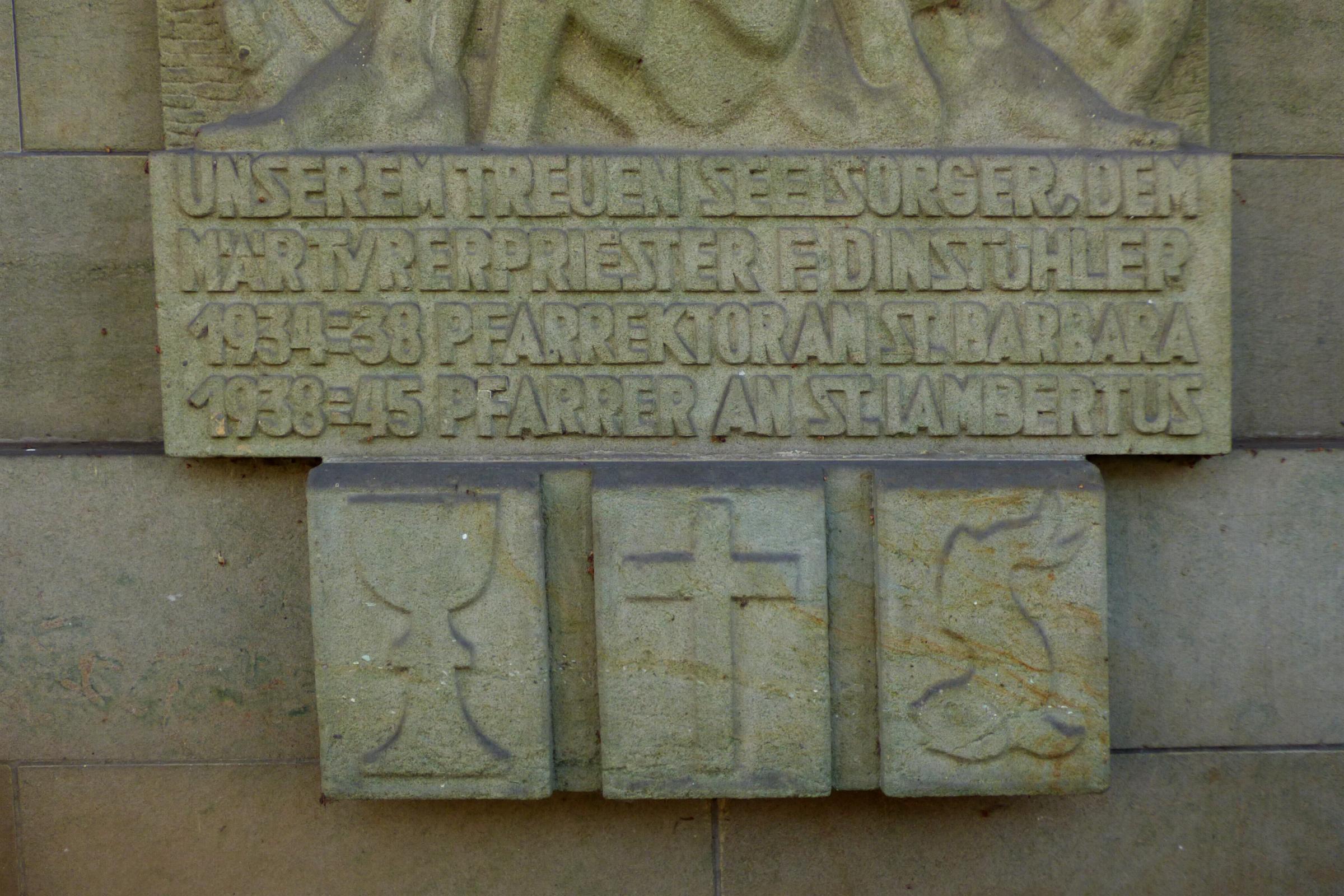 UNSEREM TREUEN SEELSORGER, DEM MÄRTYRERPRIESTER F. DINSTÜHLER 1934 - 38 PFARREKTOR AN ST. BARBARA 1938 - 45 PFARRER AN ST. LAMBERTUS Quellenhinweis: * Pfarrer Friedrich Dinstühler – ein Zeuge der Kirchenverfolgung (Blog Forum Deutscher Katholiken) * Dinstühlers Mut mit dem Leben bezahlt (RP-Online v. 27. Juni 2015) * Gedenktafel Pfarrer F. Dinstühler in Hückelhoven (Onlineprojekt Gefallenendenkmäler) * Totenzettel von Pfarrer Friedrich Dinstühler (Totenzettelsammlung WGFF) * Stolperstein Pfarrer Friedrich Dinstühler (Eschweiler-juden.de)