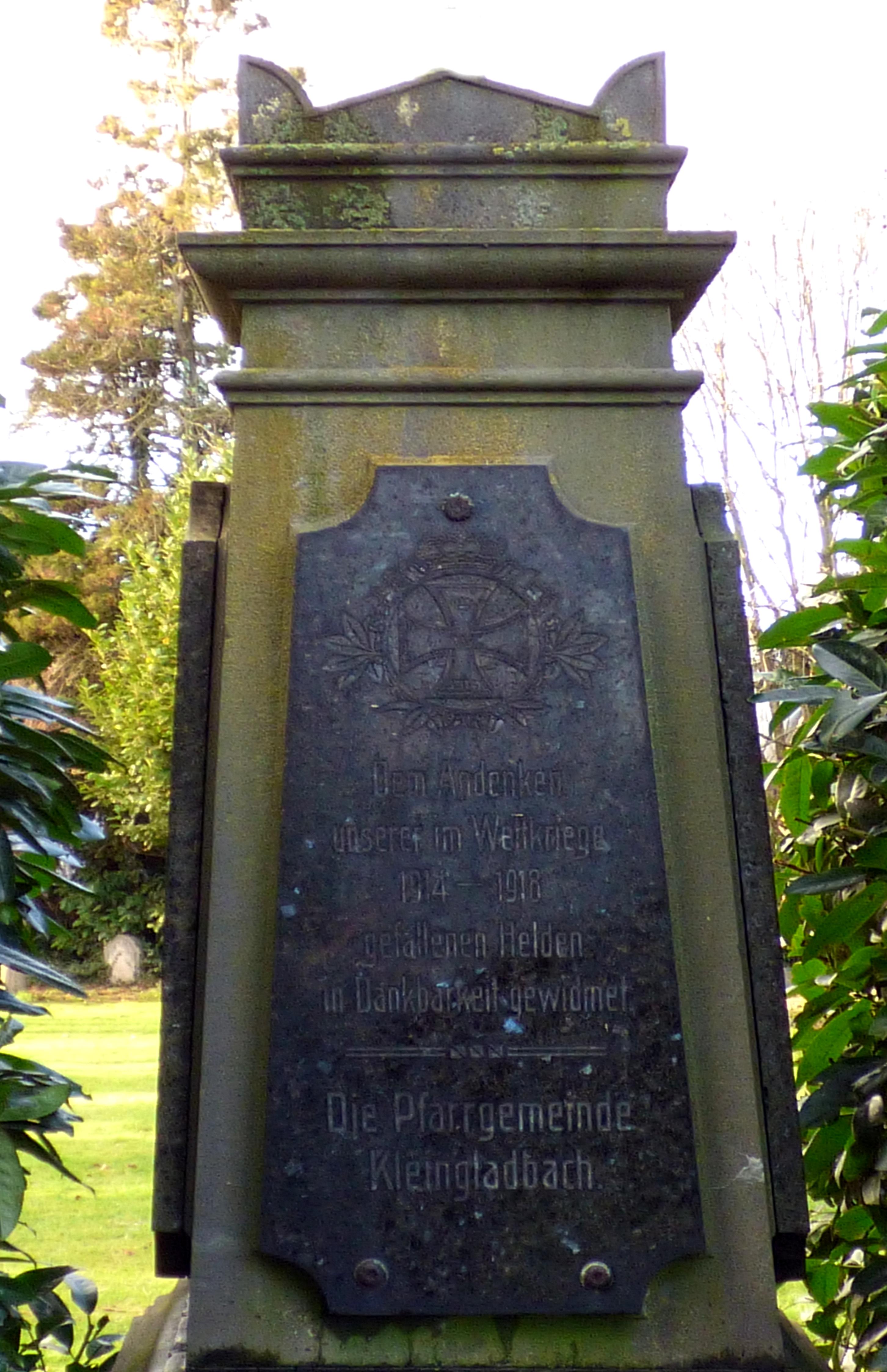 Andenken unserer im Weltkriege 1914 - 1918 Quellenhinweis: * Kriegsgräberstätte auf dem Friedhof in Kleingladbach (Volksbund Deutsche Kriegsgräberfürsorge e.V.) * Gefallenendenkmal in Kleingladbach (Onlineprojekt Gefallenendenkmäler)