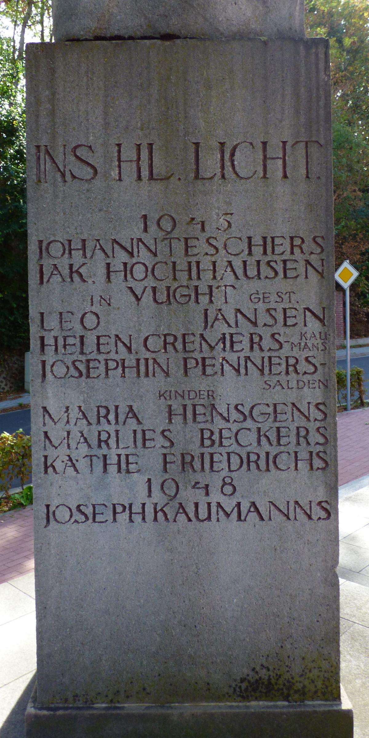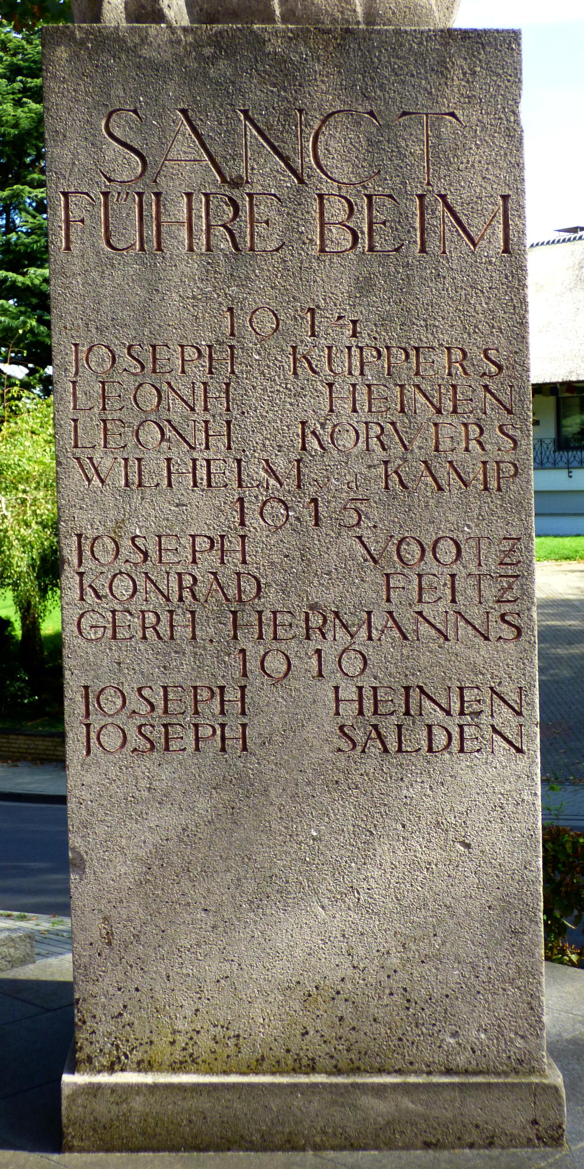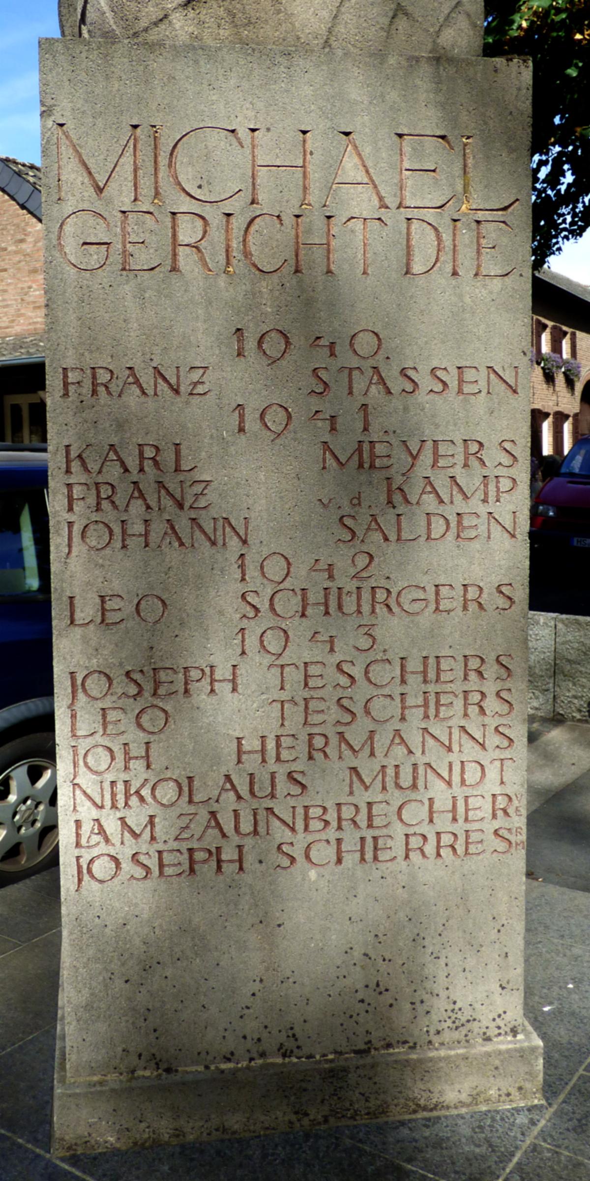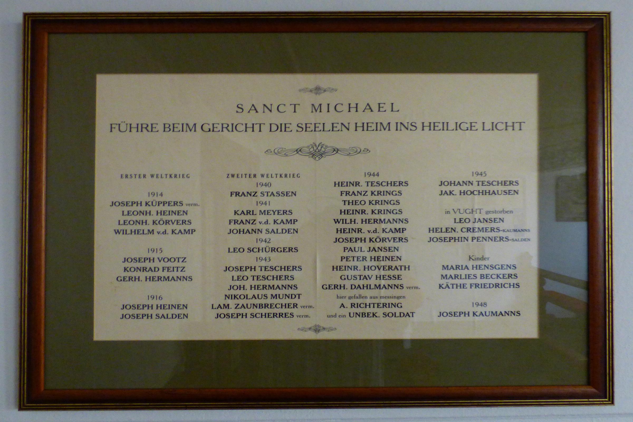 Standort: Das Ehrenmal befindet sich an der Michaelstraße 1, im Ortsteil Hillensberg, in der Gemeinde Selfkant. Geschichte: Das Ehrenmal besteht aus einer Gedenksäule und vier Namenstafeln im Sockelbereich. Eine Infotafel mit den Namen befindet sich auch in der Kirche. Das Ehrenmal wurde zu Ehren der Gefallenen und der Vermißten des Ersten und Zweiten Weltkrieges errichtet. Es soll den Überlebenden zur Mahnung und den Verstorbenen zur Ehre dienen. * Gefallenendenkmal und Ehrenmal in Hillensberg Onlineprojekt Gefallenendenkmälerr