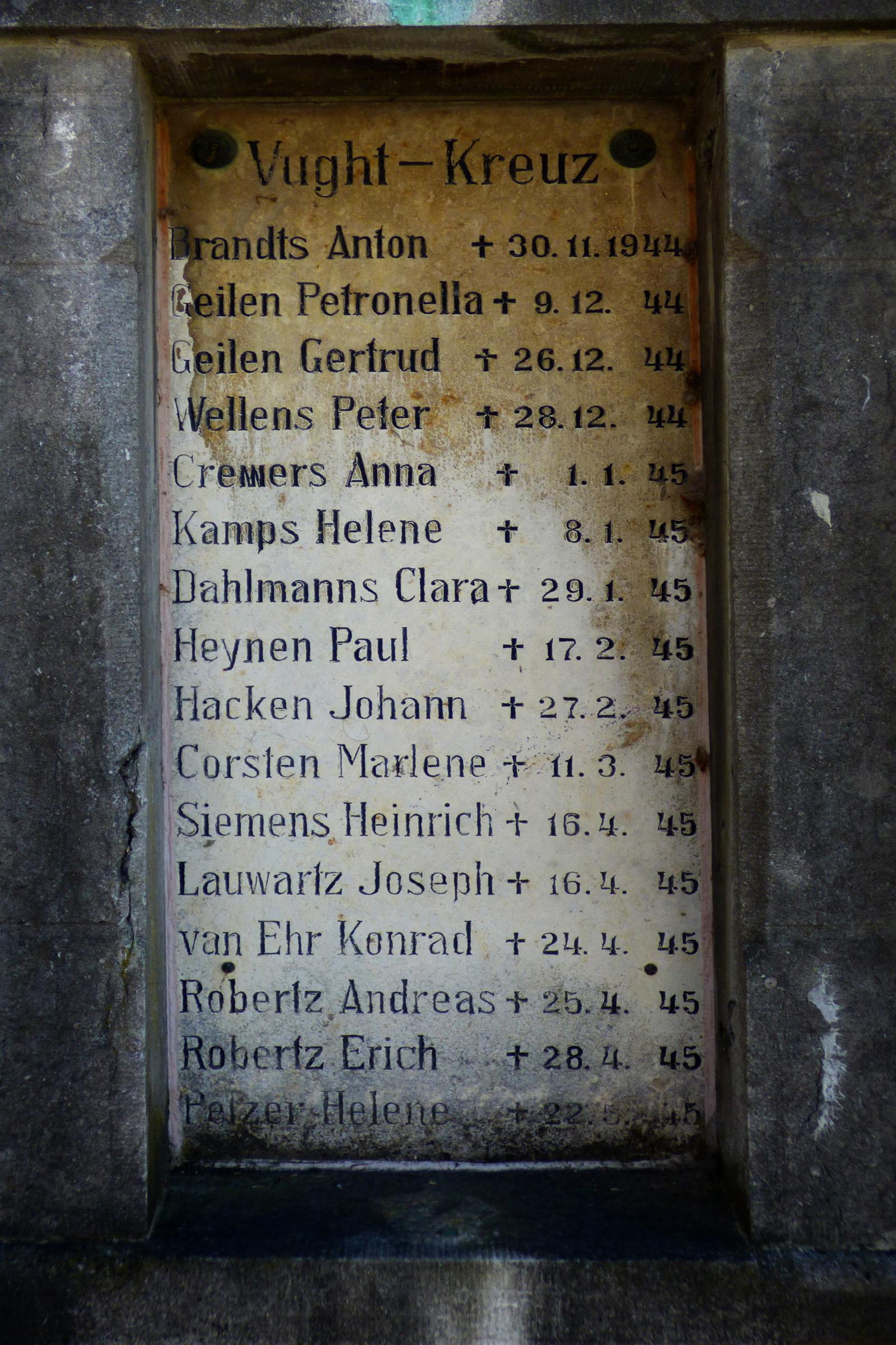 Standort: Das Gedenkkreuz auch Vught Kreuz genannt hat seinen Standort An der Tränke, im Ortsteil Wehr, in der Gemeinde Selfkant. Geschichte: Bei dem Gedenkkreuz handelt es sich um ein ca. 2,50 m hohes Steinkreuz ohne Korpus. Im Mittelteil des Kreuzes befindet sich eine Steintafel mit den Namen verstorbener Personen während der Kriegszeit.