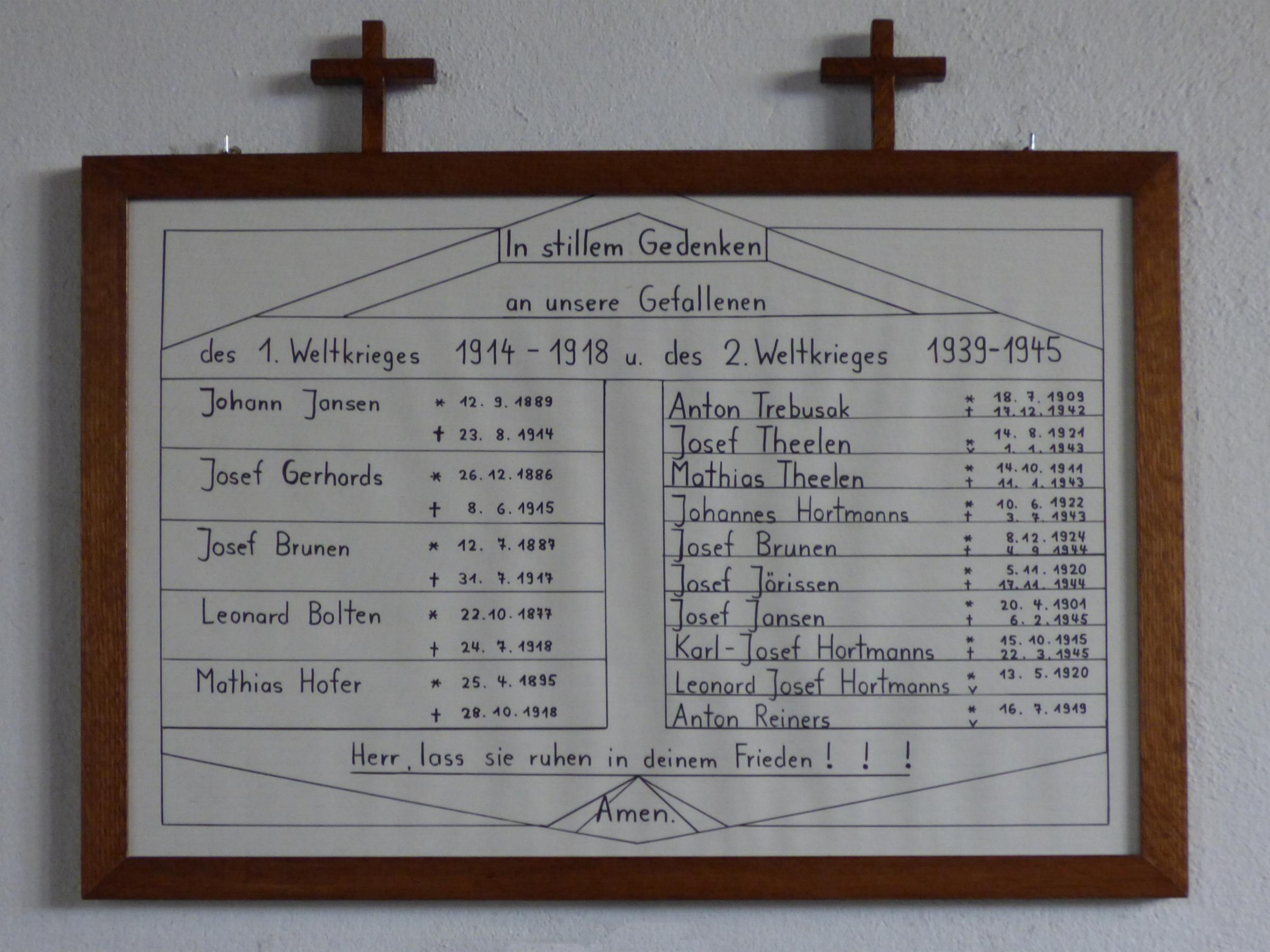 Standort und Beschreibung: Die Ehrentafel befindet sich in der Kapelle in Schönhausen in der Stadt Wegberg. Sie wurde 2010 nach umfangreichen Recherchen erstellt und erinnert an die Gefallenen beider Weltkriege der Kapellengemeinschaft Bissen, Felderhof und Schönhausen.