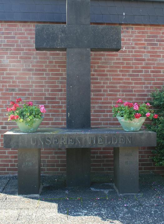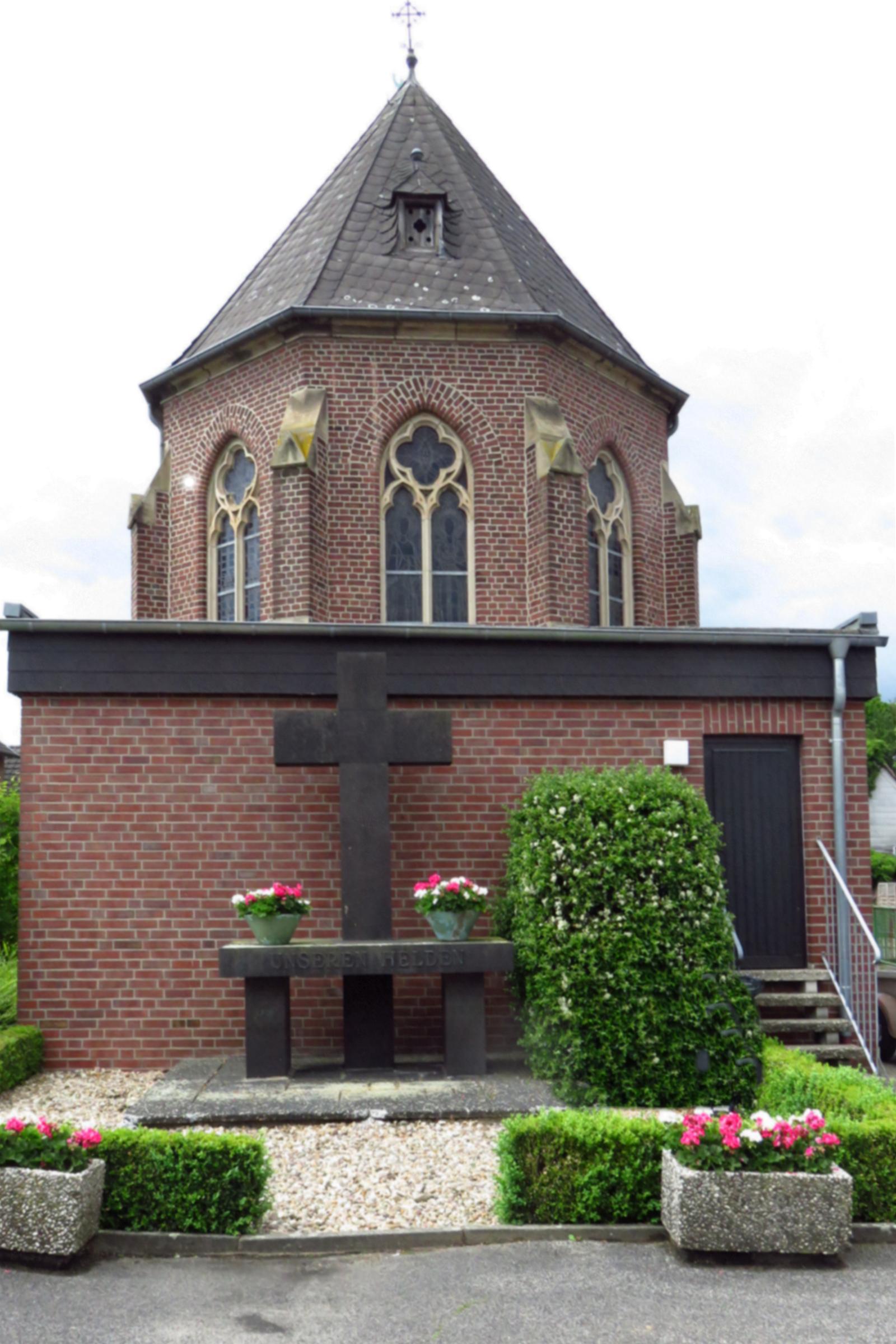 ![]() Standort und Beschreibung: Das Kriegerehrenmal an der Kapelle St. Barbara in Uevekoven wurde am 1. September 1955 vom Pfarrer Bremer feierlich eingeweiht. Das Ehrenmal ist in altarähnlicher Form errichtet. Es trägt in seinem unteren Bereich die Aufschrift "1914-1918" und "1939-1945". Im Zuge des Straßenausbaus wurde das Ehrenmal an seine heutige Stelle versetzt. Quellenhinweis: * Text: Historischer Verein Wegberg e.V.