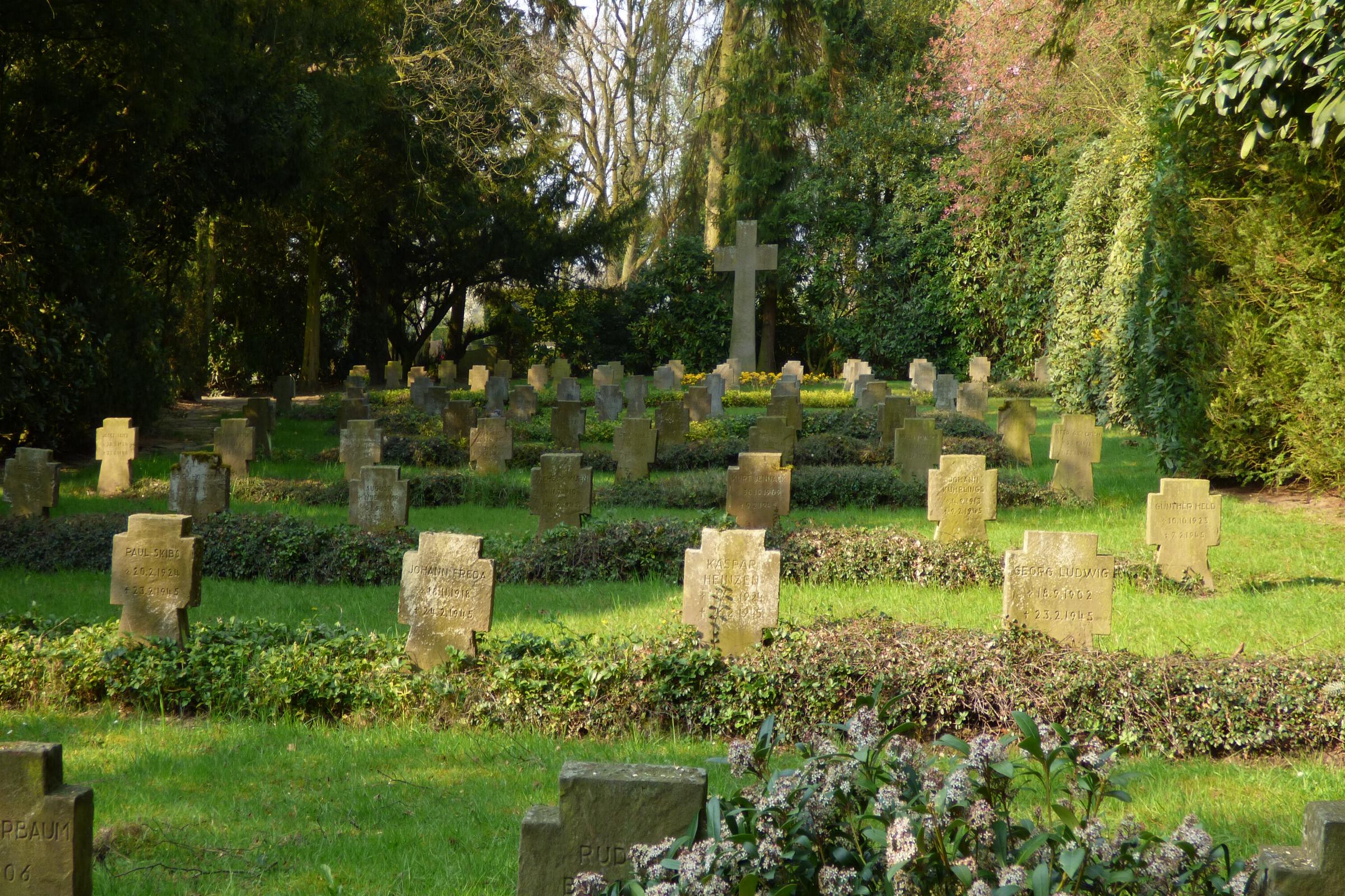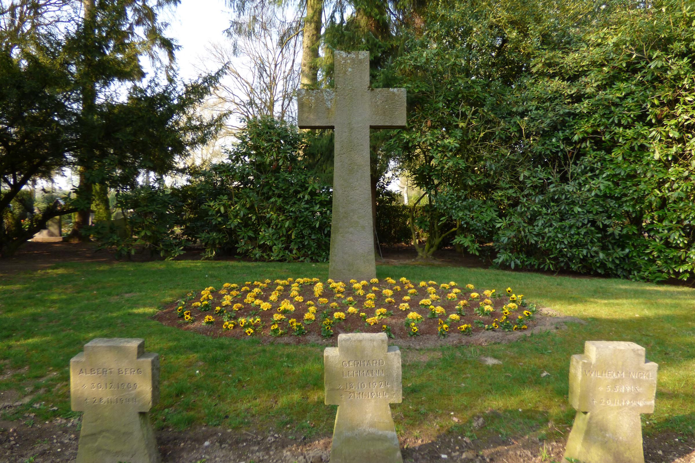 Standort und Beschreibung: Der Ehrenfriedhof von Wegberg befindet sich auf der Friedhofanlage an der Friedhofstraße in Wegberg. Hier fanden 137 Kriegstote ihre letzte Ruhe. Am Eingang des Friedhofs befindet sich an der linken Seite die Friedhofskapelle. Der Ehrenfriedhof mit den verstorbenen und vermißten Soldaten, der Schwesternfriedhof des Ordens und auch der Ordensfriedhof der Karmeliter sind Bestandteil der Friedhofanlage. Bis weit in die 1950er Jahre hinein waren die Kriegsgräber der Gefallenen des zweiten Weltkrieges auf insgesamt sechs Friedhöfe des Gemeindegebietes von Wegberg verteilt. Da dieser Umstand allgemein als unglücklich empfunden wurde, entschloss sich die Gemeinde, die Mehrzahl der Gräber auf einen hierfür neu zu errichtenden Ehrenfriedhof in Wegberg zusammenzulegen. Der neue Ehrenfriedhof, integriert in den Waldfriedhof, wurde am 28. August 1955 eingeweiht. Die Anlage wurde von dem Gartenarchitekten Georg Reepel aus Düren entworfen. (Text: Historischer Verein Wegberg e.V.)