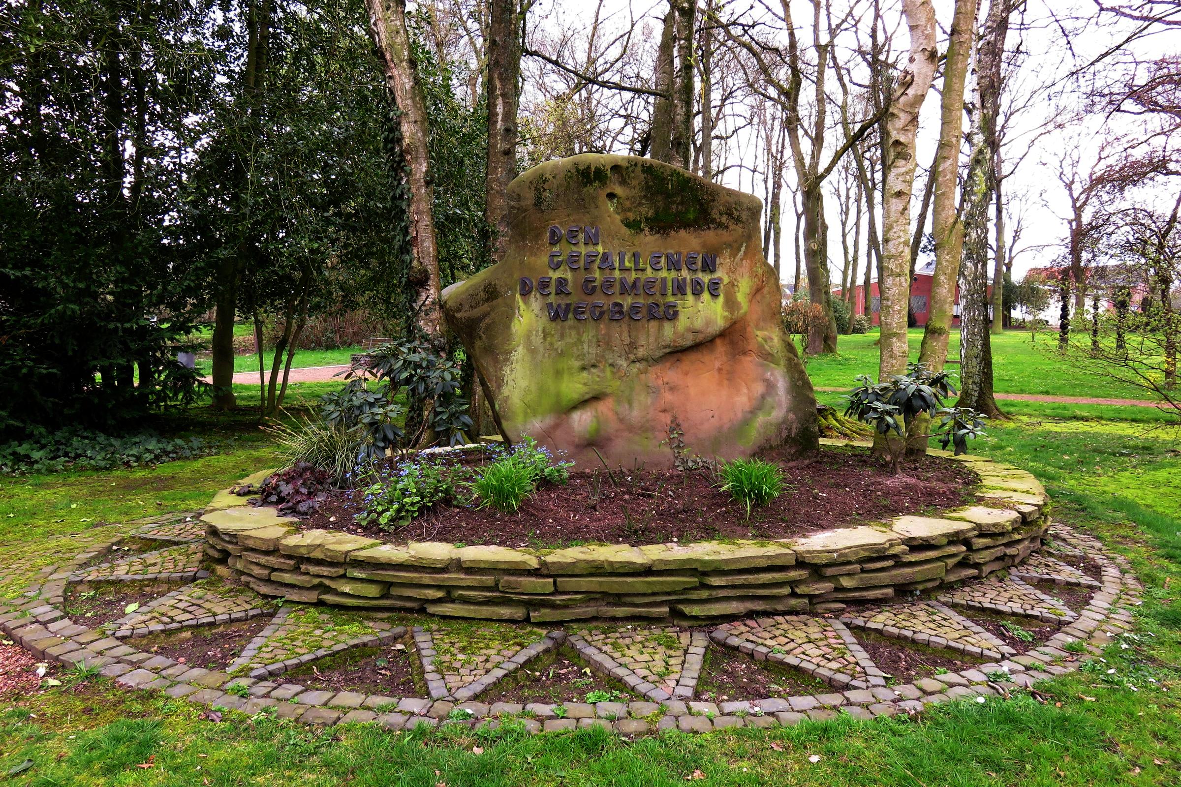 Standort und Beschreibung: Das Ehrenmal, ein größerer Findling, befindet sich etwa in der Mitte des Stadtparks, in der Nähe des ehemaligen Mühlenweihers. Es trägt die Aufschrift: "Den Gefallenen der Gemeinde Wegberg". Der Findling stammt aus Rosenthal bei Wassemberg und wurde von dort etwa um 1949/50 auf Initiative der damaligen Schützengesellschaft Berka und unter Mithilfe des englischen Militärs hierhin verbracht. Der Gedenkstein wurde im Jahr 1951 feierlich eingeweiht. Quellenhinweis: Historischer Verein Wegberg e.V.