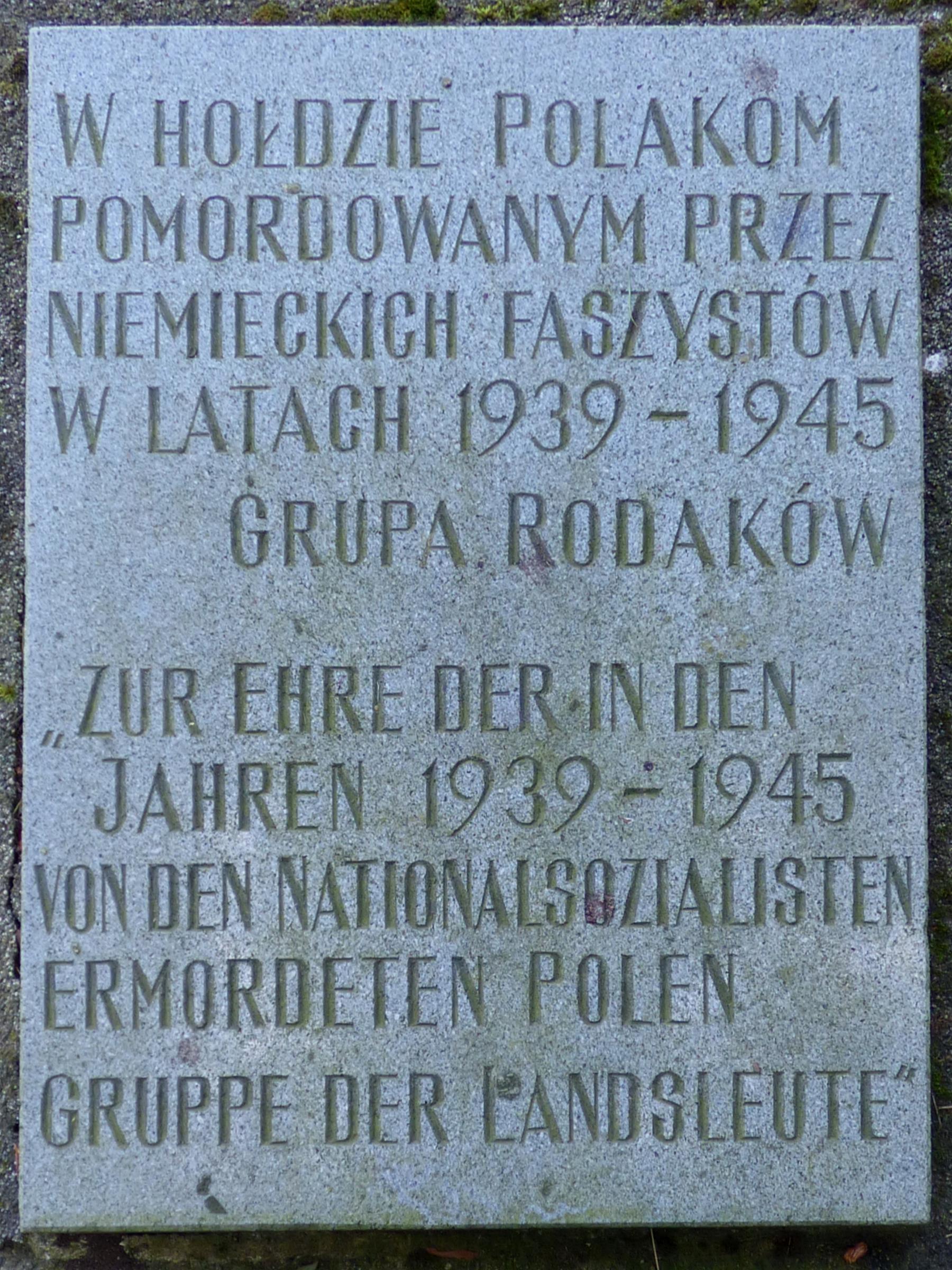 Standort und Beschreibung: Im nordöstlichen Teil des Waldfriedhofes in Wegberg befindet sich in einem Bereich mit vier Ehrengedenksteinen, die die Namen dreier polnischer Bürger tragen: Edmund Baczynski, Antoni Matusik und Franciszek Grundnicki. Alle drei sind noch nach dem zweiten Weltkrieg, zwischen 1948 und 1949, an den Folgen des Krieges gestorben. Einer der vier Gedenksteine trägt in deutscher und polnischer Sprache die Aufschrift: "Zur Ehre der in den Jahren 1939 - 1945 von den Nationalsozialisten ermordeten Polen. Gruppe der Landsleute. (Text: Historischer Verein Wegberg e.V.)