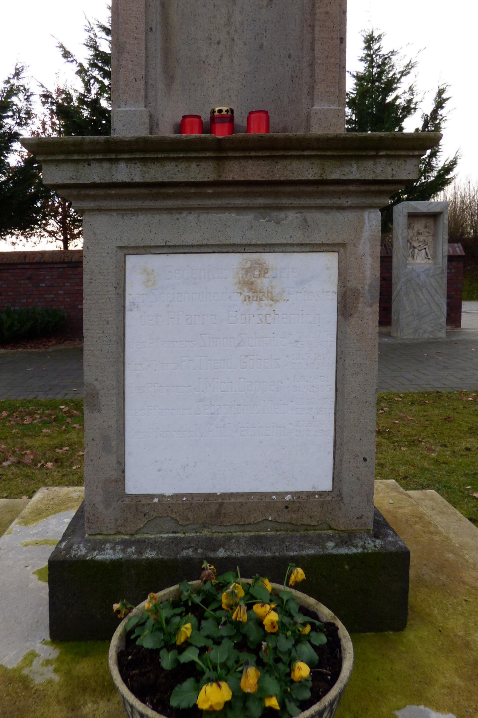 Standort: Das alte Priesterkreuz befindet sich auf dem Friedhof an der Marienstiftstraße in Borschemich, in der Stadt Erkelenz. Es ist Bestandteil der Friedhofanlage. Beschreibung: Bei der Gestaltung des Friedhofs im Jahre 1926 wurde das Grabkreuz der Familie Ringelkamp zum Friedhofskreuz umfunktioniert. Das Friedhofskreuz bekam eine Tafel mit den Daten der verstorbenen Priester und diente somit als Priestergrabstätte. Auf der rechten Seite des Kreuzes sind noch die Inschriften der Verstorbenen aus der Familie Ringelkamp erhalten. Mit der Umsiedlung der Ortschaft Borschemich fand das Priesterkreuz auf dem neuen Friedhof auch einen würdigen Platz. Inschrift der Priestertafel: Gedenket im Gebet der Seelenruhe der Hochw. Preister der Pfarre Borschemich des Pfarrers Simon Schmitz * 15.7.1756 + 26.8.1837 des Vikars Friedrich Theodor Göbels * 13.5.1816 + 20.10.1844 des Pfarrers J. Michael Dapper * 1.6.1801 + 31.5.1885 des Pfarrers Sebastianus Klein * 24.10.1826 + 29.3.1993 des Pfarrers Karl Anton Weinsheim * 27.6.1844 + 3.2.1912