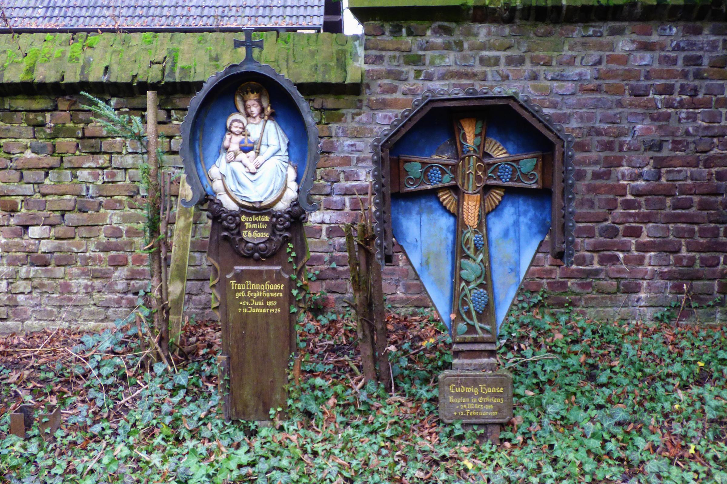 Standort: Die Friedhofanlage befindet sich an der Brückstraße in Erkelenz und wird auch Alter Friedhof genannt Zur Friedhofanlage gehören neben zahlreichen noch vorhandenen Gräbern das Friedhofskreuz von 1827, das Friedhofskreuz von 1884, die Priestergrabstätten. das Ehrenmal und der Ehrenfriedhof 1914 - 1918, die russischen Zwangsarbeiter und die Hist. Grabsteine. Beschreibung: Der Alte Friedhof an der Brückstraße ist der älteste Gemeindefriedhof im heutigen Stadtgebiet. 1820 kaufte die Stadt dort eine Fläche für 246 Rheinische Taler und errichtete bald darauf an der Straßenseite eine Mauer mit Tor. Während des 19. Jh. wurde der Friedhof mehrfach vergrößert und diente bis 1970 als Begräbnisstätte. Die gesamte Anlage steht seit Jahren unter Denkmalschutz, da sie auch heute noch eine größere Zahl von Grabdenkmälern aus dem 19. Jh. und der ersten Hälfte des 20. Jh. beherbergt und sie von allen Friedhöfen der heutigen Stadt Erkelenz eine Sonderstellung einnimmt. Der Friedhof erhält so nach und nach den Charakter einer Parkanlage mit Grünflächen, Bäumen und Sträuchern. Der heutige Restbestand an Denkmälern läßt erkennen, welchen kulturellen Reichtum der Friedhof früher besaß und - mit Einschränkungen - immer noch besitzt. Kunsthistorisch überwiegen die Merkmale des Klassizismus und der Neugotik, und als Baumaterialien sind Blaustein, Sandstein, Granit und (seltener) Eisen verbreitet. So besitzt der Alte Friedhof auch in der Gegenwart für die Stadt Erkelenz immer noch einen beachtlichen kulturellen Wert. Quellenhinweis: * Schriftenreihe des Heimatvereins der Erkelenzer Lande e.V. Nr. 17 Zeichen am Wege S. 73 / 74 von Paul Blaesen * Alter Friedhof an der Brückstraße in Erkelenz bei Wikipedia * Alter Friedhof verwüstet (RP-Online v. 13. Oktober 2011)