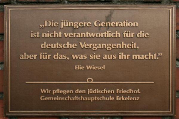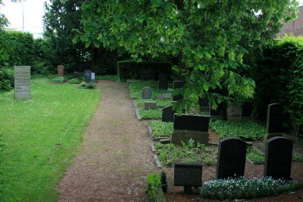 gepflegt. Beschreibung: Die Parzelle des jüdischen Friedhofs liegt nach wie vor inmitten eines überwiegend gewerblich genutzten Gebietes. Sie ist eingefriedet, zur Straße hin mit einer Backsteinmauer und einem zweiflügeligen Tor, beide augenscheinlich wohl aus der Nachkriegszeit. Der Friedhof selbst liegt deutlich unter Straßenniveau und ist über einige Treppenstufen zu erreichen. Die Fläche ist etwa hälftig mit Grabstätten besetzt, die fast alle auch noch einen Grabstein besitzen. Die andere Hälfte links des Mittelweges ist als Rasenfläche gestaltet; auf ihr ein Gedenkstein der Stadt Erkelenz (Inschrift: „Den toten jüdischen Bürgern der Stadt Erkelenz zum Gedenken“) Die Grabstätten sind rechts
