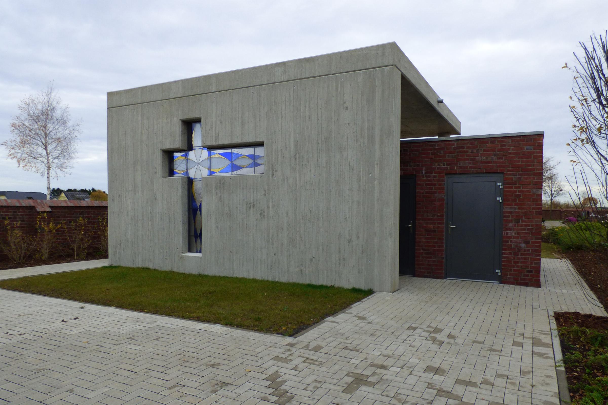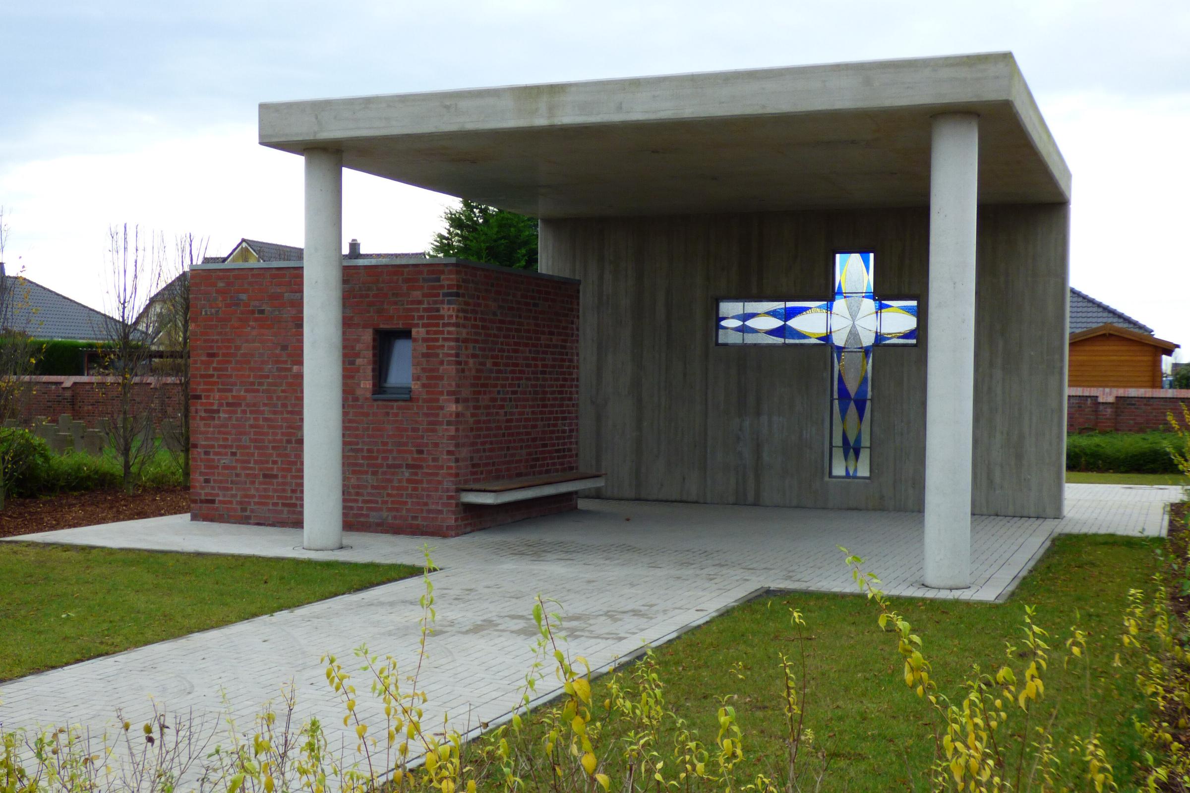 Standort: Die Aussegnungshalle befindet sich auf dem Friedhof an der Pescher Straße in Immerath, in der Stadt Erkelenz. Sie ist Bestandteil der Friedhofanlage. Beschreibung: Nach einer Planungs- und Bauzeit von 2 Jahren wurde die Aussegnungshalle des Friedhofs in Immerath ihrer Bestimmung übergeben. In einer Feierstunde am 5. August 2016, an der zahlreiche Bürger teilnahmen, wurde die Halle von Pfarrer Werner Rombach eingesegnet. Das Glaskreuz in der Aussenwand wurde vom Glaskünstler Markus Steffens aus Wassenberg entworfen. Quellenhinweis: * Friedhof in Immerath bekommt eine Aussegnungshalle (AZ v. 27. März 2015) * Segen für die neue Aussegnungshalle (RP-Online v. 8: August 2016)