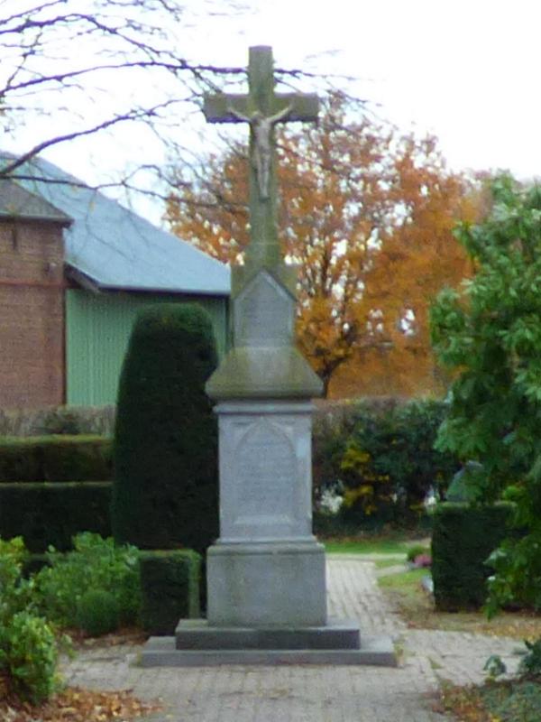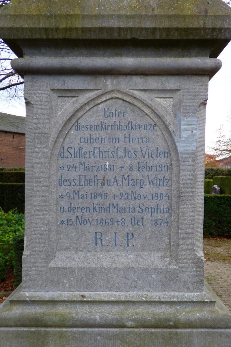 Standort: Das Hochkreuz befindet sich auf dem Friedhof am Rainer - Langen - Weg in Katzem, in der Stadt Erkelenz. Es ist Bestandteil der Friedhofanlage. Beschreibung: Bei den Hochkreuz handelt es sich um ein 4,20 m hohes Sandsteinkreuz mit einem Metallkorpus. Das neugotische Kreuz wurde 1907 errichtet und trägt zwei Inschriften: WER AN MICH GLAUBT WIRD LEBEN WENN ER AUCH GESTORBEN IST ------------------------------------------------------------------- Unter diesem Kirchhofkreuze ruhen im Herrn d. Stifter Christ. Jos. Vieten * 24. März 1831 + 8. Febr. 1911 dess. Ehefrau A. Marg. Wirtz * 9. Mai 1846 * 23. Nov. 1904 u. deren Kind Maria Sophia * 15. Nov. 1869 + 8. Oct. 1874 R I P Quellenhinweis: * Schriftenreihe des Heimatvereins der Erkelenzer Lande e.V. Nr. 17 Zeichen am Wege Seite 116 von Paul Blaesen