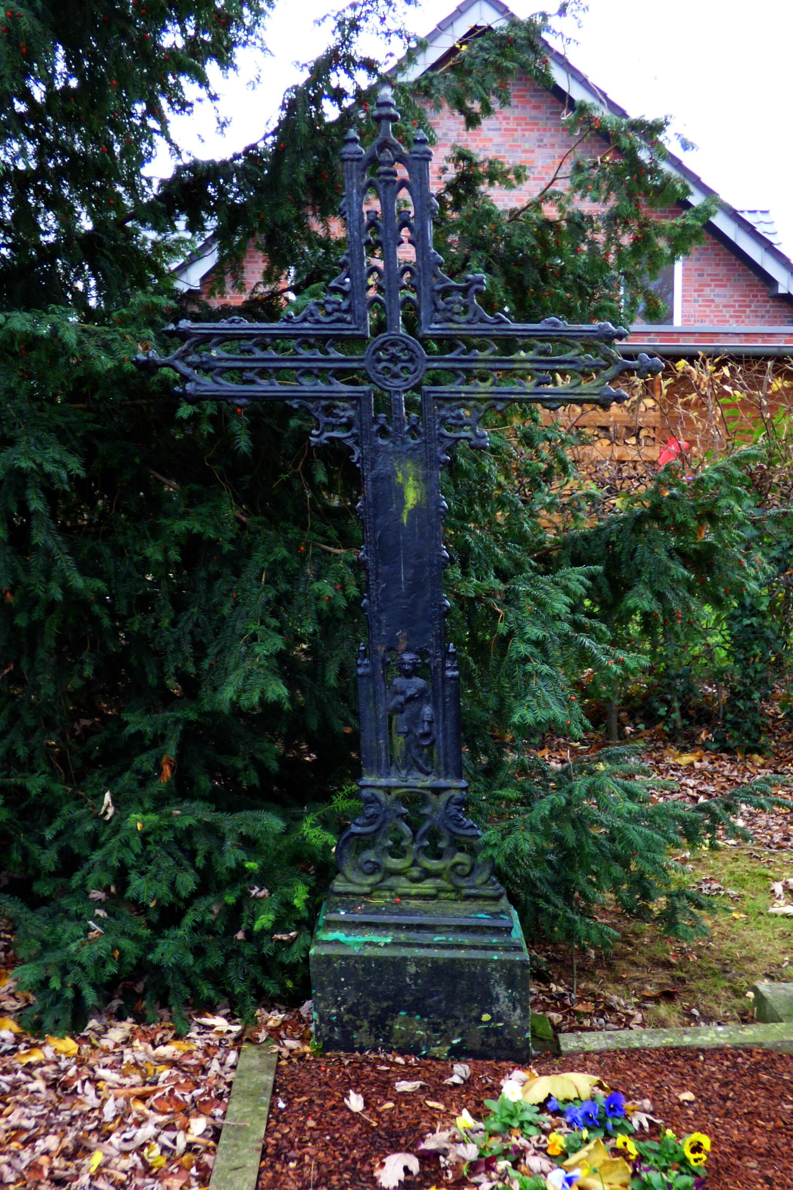 Standort: Das Stifterkreuz Rainer Langen befindet sich am Rainer - Langen - Weg in Katzem, in der Stadt Erkelenz. Das Stifterkreuz ist Bestandteil der Friedhofanlage. Beschreibung: Stifter des Friedhofes war Rainer Langen, nach dem die Straße zum Friedhof benannt wurde. Sein Grabmal ist noch erhalten und dürfte zu den ältesten Grabmälern des Friedhofs zählen. Aus den Resten der Inschrift ergibt sich mit großer Wahrscheinlichkeit "Rainer Langen, Stifter des Kirchhofs". Das Kreuz zeichnet sich durch Material und Formgebung besonders aus und ist eines der wenigen Gußkreuze, die in der Stadt Erkelenz noch existieren. Quellenhinweis: * Schriftenreihe des Heimatvereins der Erkelenzer Lande e.V. Nr. 17 Zeichen am Wege Seite 114 von Paul Blaesen