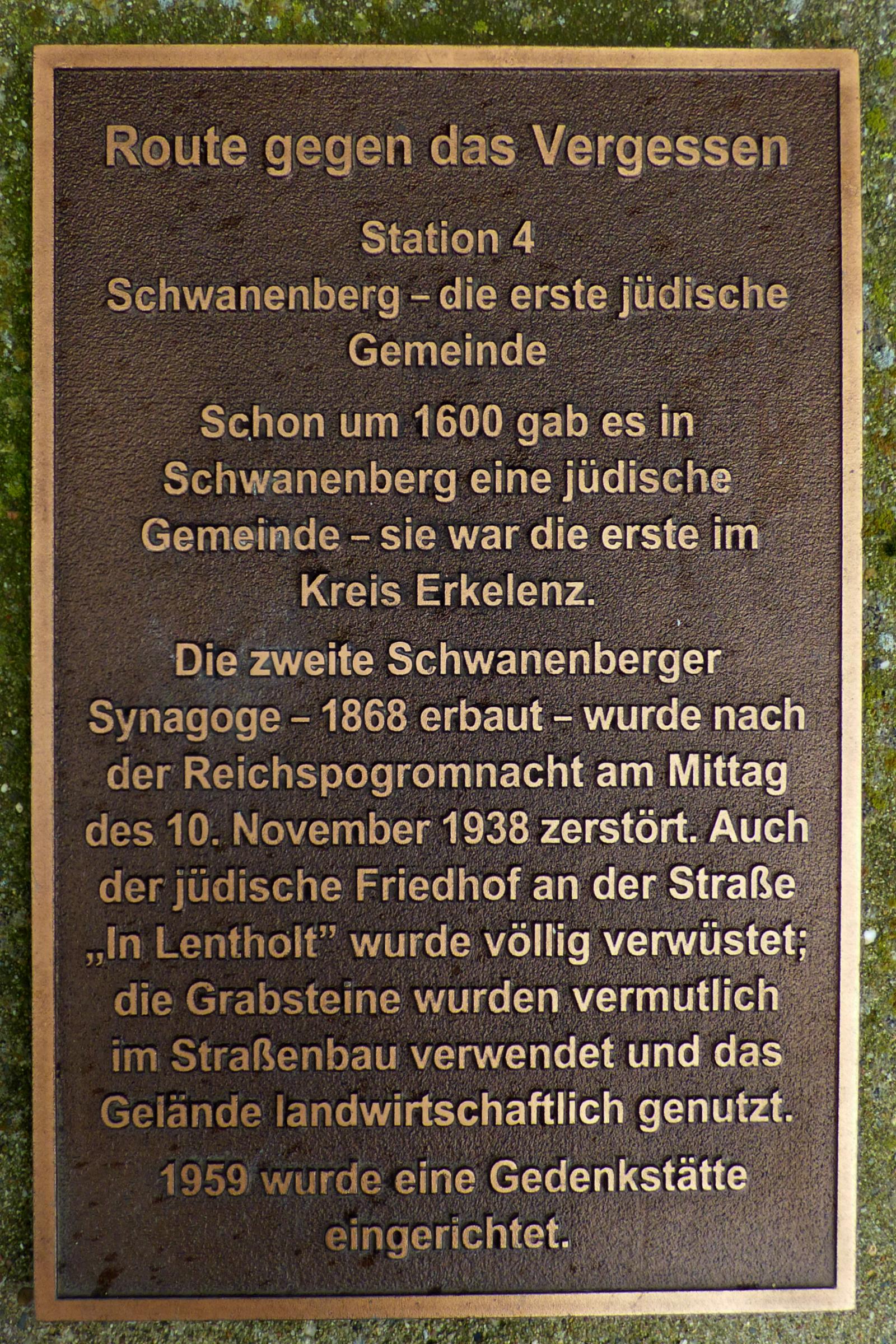 Bestimmung des Grundstücks. Denkmalwert: Die Parzelle überliefert den Ort und die Bestattungen des seit 1821 an dieser Stelle befindlichen Friedhofs der ehemals bedeutenden jüdischen Gemeinde von Schwanenberg. Sie ist daher bedeutend für Erkelenz. Die heutige Gedenkstätte ist angemessen gestaltet und bewahrt als eingefriedete Parzelle mit Gedenkstein den Charakter als ehemaliger jüdischer Friedhof. Quellenhinweis: * Schriftenreihe des Heimatvereins der Erkelenzer Lande e.V. Nr. 17 Zeichen am Wege S. 271 von Paul Blaesen * Heimatkalender der Erkelenzer Lande 1969, Die Erkelenzer Friedhöfe S. 108 - 117 von Josef Lennartz * Denkmal Nr. 337 der Stadt Erkelenz v. 14. Januar 2008
